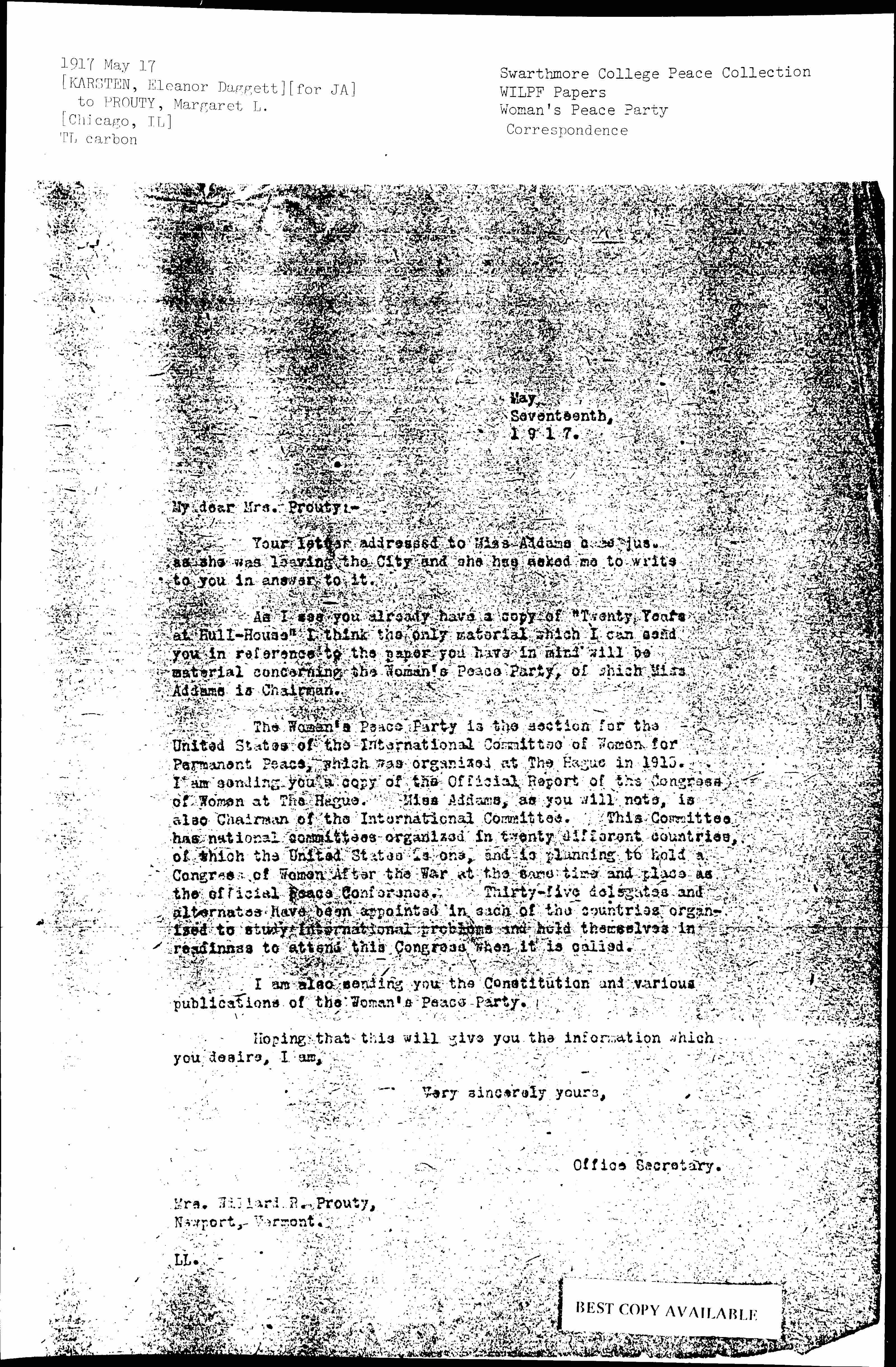 The Woman's Peace Party is the section for the United States of the International Committee of Women for Permanent Peace, which was organized at The Hague in 1915. I am sending you a copy of the Official Report of the Congress of Women at The Hague. Miss Addams, as you will note, is also Chairman of the International Committee. This Committee has national committees organized in twenty different countries, of which the United States is one, and is planning to hold a Congress of Women After the War at the same time and place as the official Peace Conference. Thirty-five delegates and alternates have been appointed in each of the countries organized to study international problems and hold themselves in readiness to attend this Congress when it is called.
