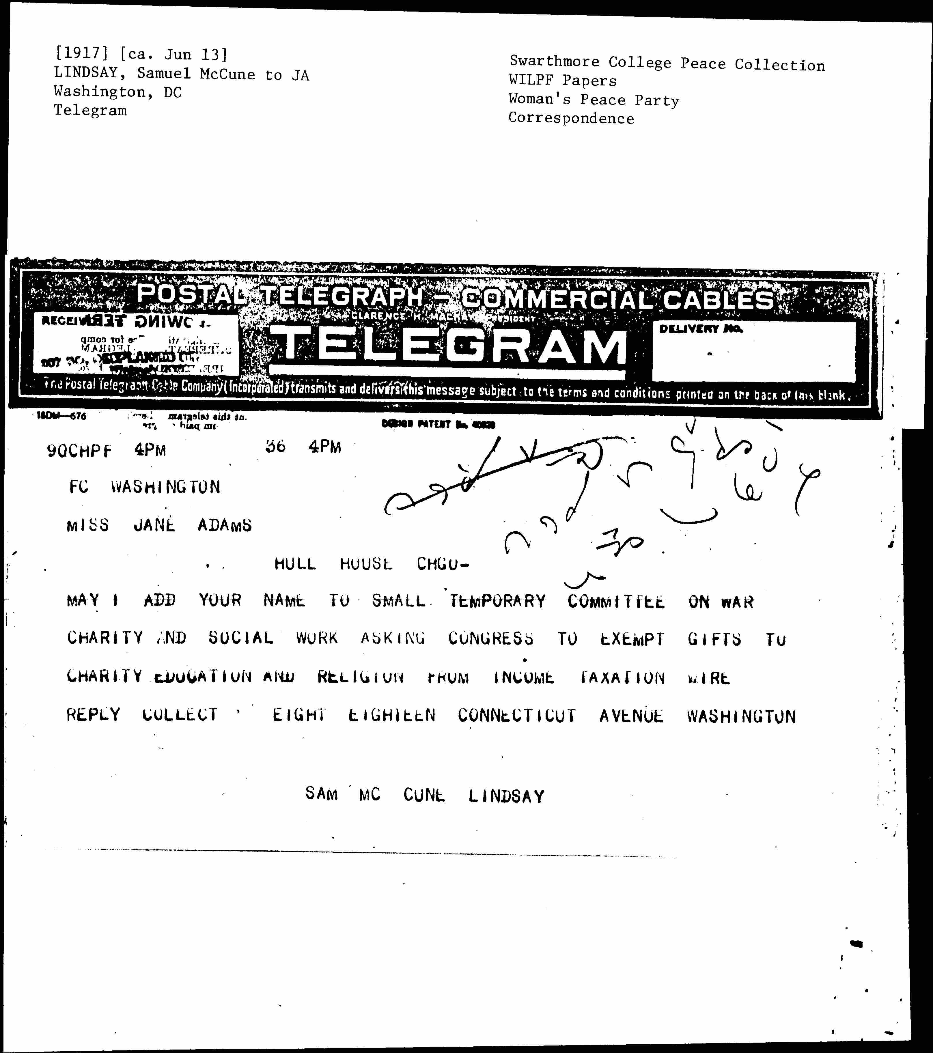 MAY I ADD YOUR NAME TO SMALL TEMPORARY COMMITTEE ON WAR CHARITY AND SOCIAL WORK ASKING CONGRESS TO EXEMPT GIFTS TO CHARITY EDUCATION AND RELIGION FROM INCOME TAXATION WIRE REPLY COLLECT EIGHT EIGHTEEN CONNECTICUT AVENUE WASHINGTON
