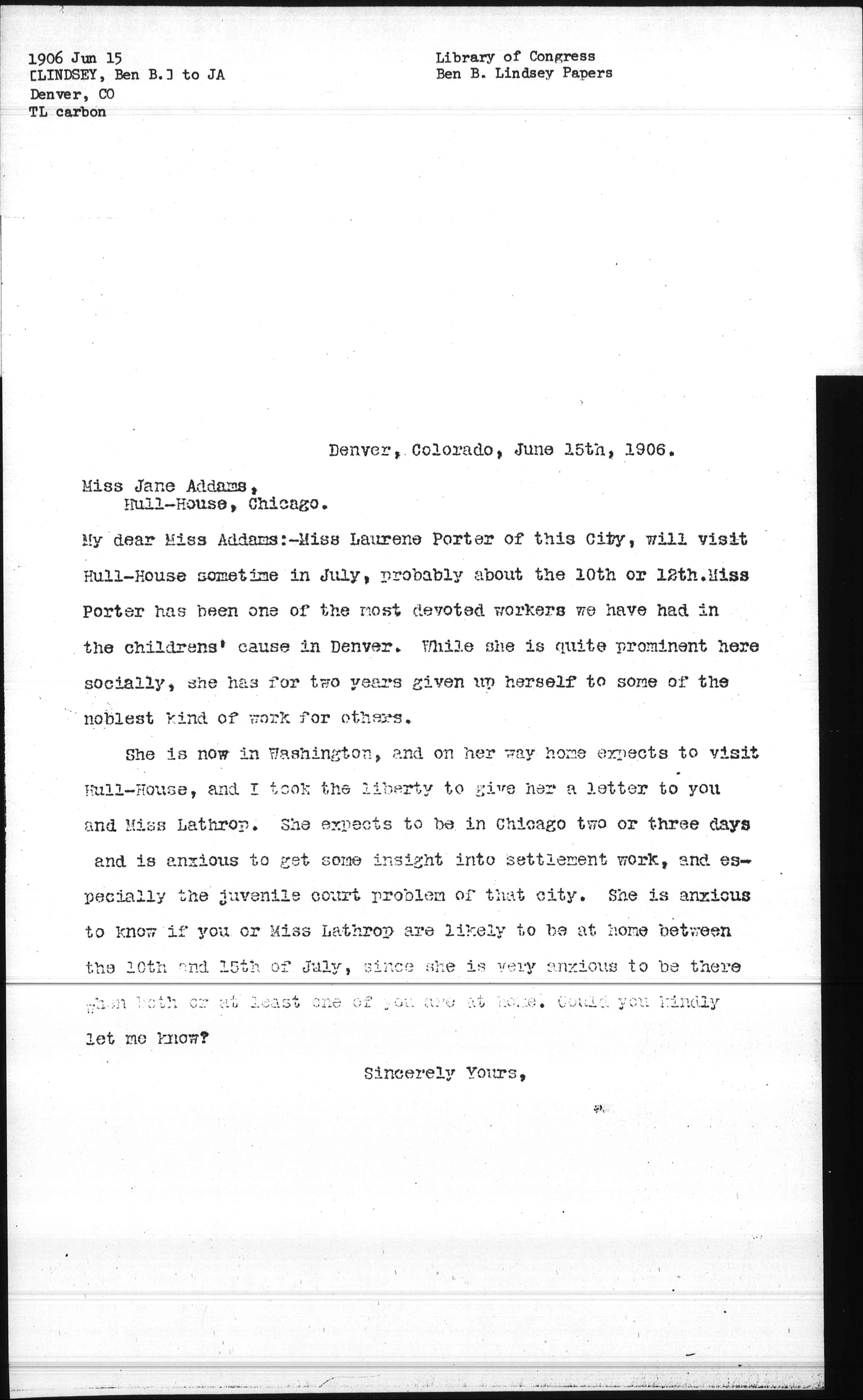 My dear Miss Addams:- Miss Laurene Porter of this City, will visit Hull-House sometime in July, probably about the 10th or 12th. Miss Porter has been one of the most devoted workers we have had in the childrens' cause in Denver. While she is quite prominent here socially, she has for two years given up herself to some of the noblest kind of work for others.
