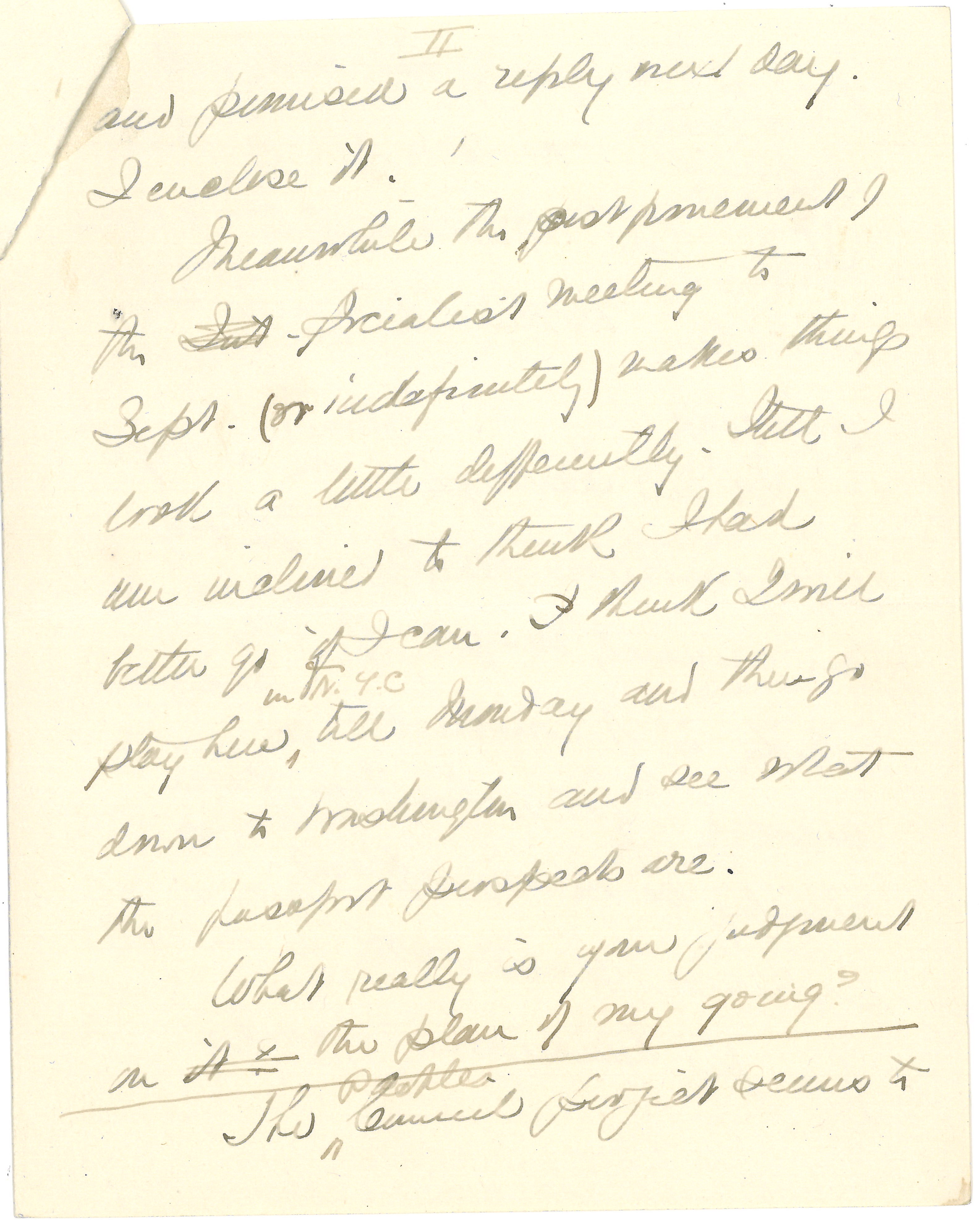 Meanwhile the postponement of the Int Socialist meeting to Sept. (or indefinitely) makes things look a little differently. Still I am inclined to think I had better go if I can. I think I will stay here ↑in N.Y.C↓ till Monday and then go down to Washington and see what the passport prospects are.