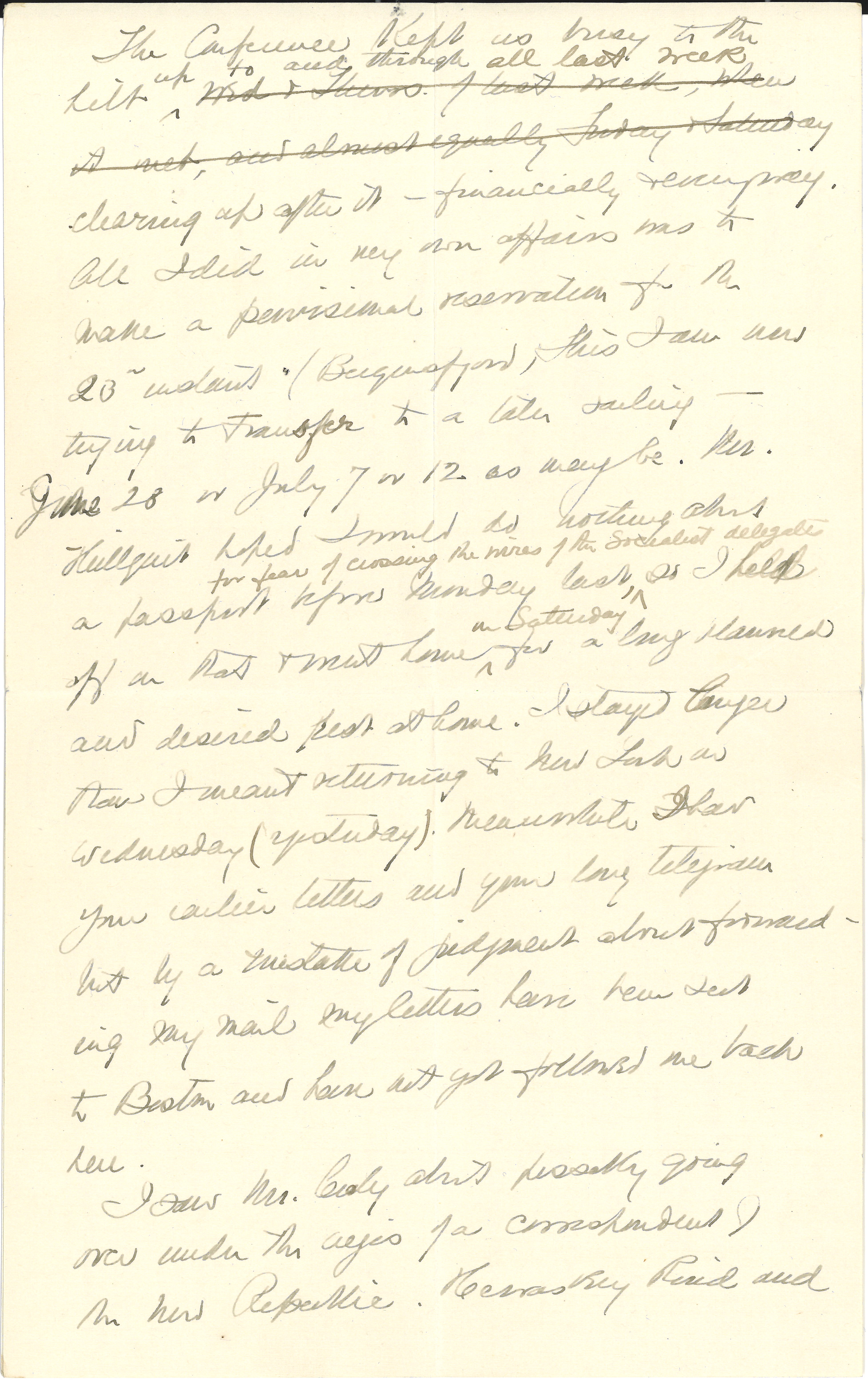 The Conference kept us busy to the hilt <up to and through all last week> Wed & Thurs. of last week, when it met, and almost equally Friday & Saturday clearing up after it -- financially & everyway. All I did in my own affairs was to make a provisional reservation for the 20th instant (Bergensfjord). This I am now trying to transfer to a later sailing -- June 28 or July 7 or 12 as may be. Mr. Hillquit hoped I would do nothing about a passport before Monday last, <for fear of crossing the wires of the Socialist delegates> so I held off on that & went home <on Saturday> for a long planned and desired rest at home. I stayed longer than I meant returning to New York on Wednesday (yesterday). Meanwhile I [had] your earlier letters and your long telegram but by a mistake of judgment about forwarding my mail my letters have been sent to Boston and have not yet followed me back here.