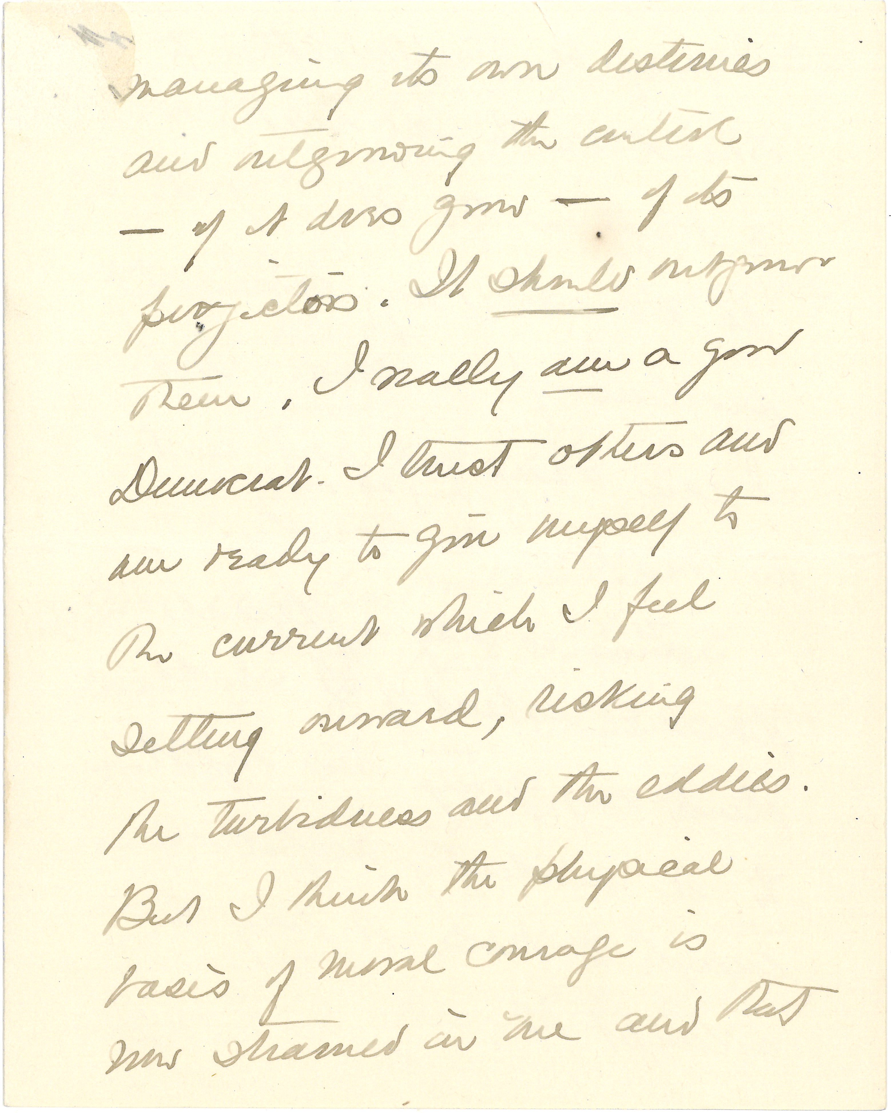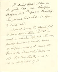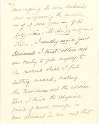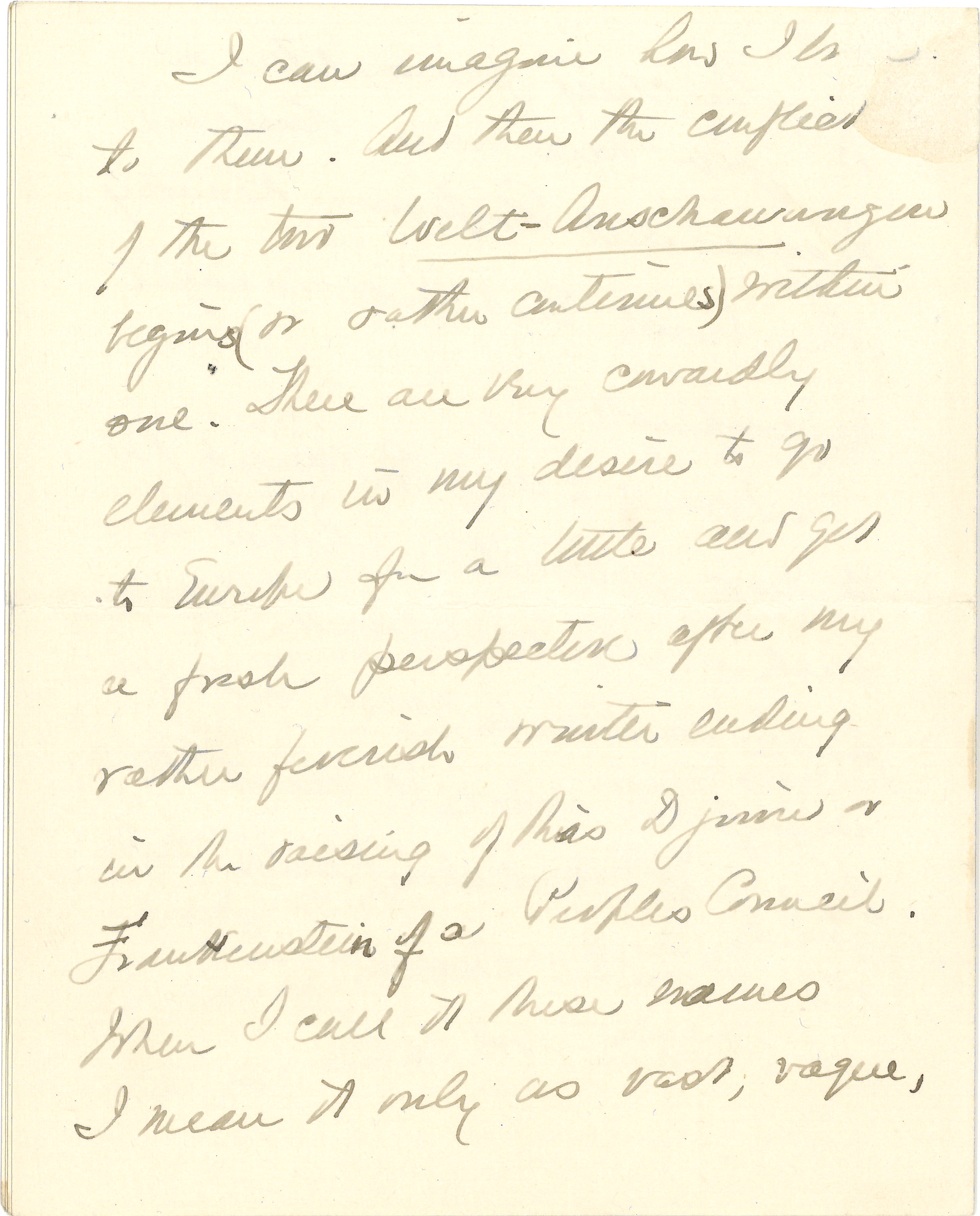 I can imagine how I [look] to them. And then the conflict of the two [Weltanschauungen] begins (or rather continues) within one. There are very cowardly elements in my desire to go to Europe for a little and get a fresh perspective after my rather feverish winter ending in the raising of this Djinni or Frankenstein of a People's Council. When I call it these names I mean it only as vast, vague, [page 7] managing its own destinies and outgrowing the [contest] -- if it does grow -- of its [projection]. It should outgrow them. I really am a good Democrat. I trust others and am ready to give myself to the current which I feel setting onward, risking the turbidness and the eddies. But I think the physical basis of moral courage is now strained in me and that [page 8] I may be [trumped] either to shirk on the one hand, or to bluff on the other, if I do not alter my personal problem for a time. And I can draw out now and in this way ↑(of going abroad)↓ so decently.