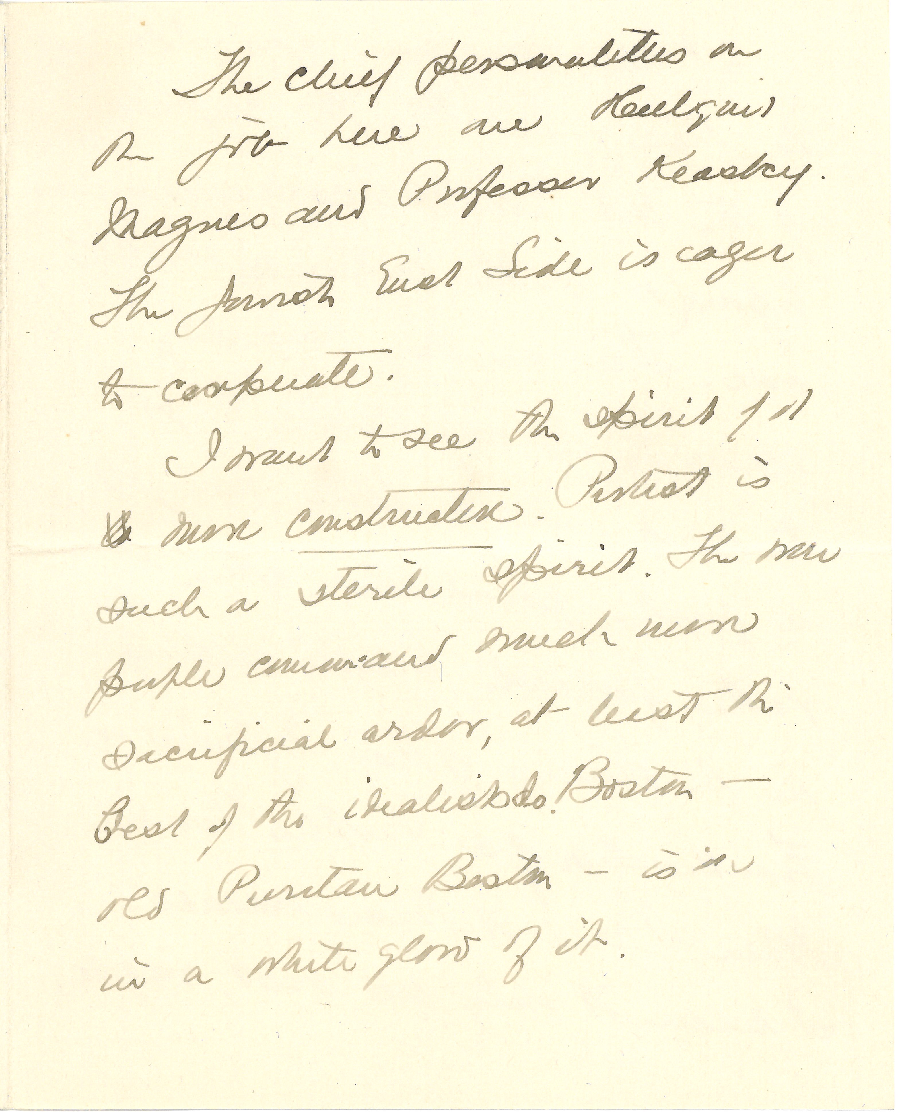 I want to see the spirit of it [illegible] more constructive. Protest is such a sterile spirit. The war people command much more sacrificial ardor, at least the best of the idealists do. Boston -- old Puritan Boston -- is in a white glow of it. [page 6]