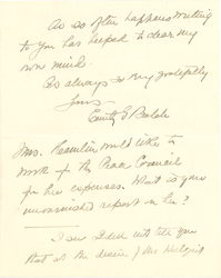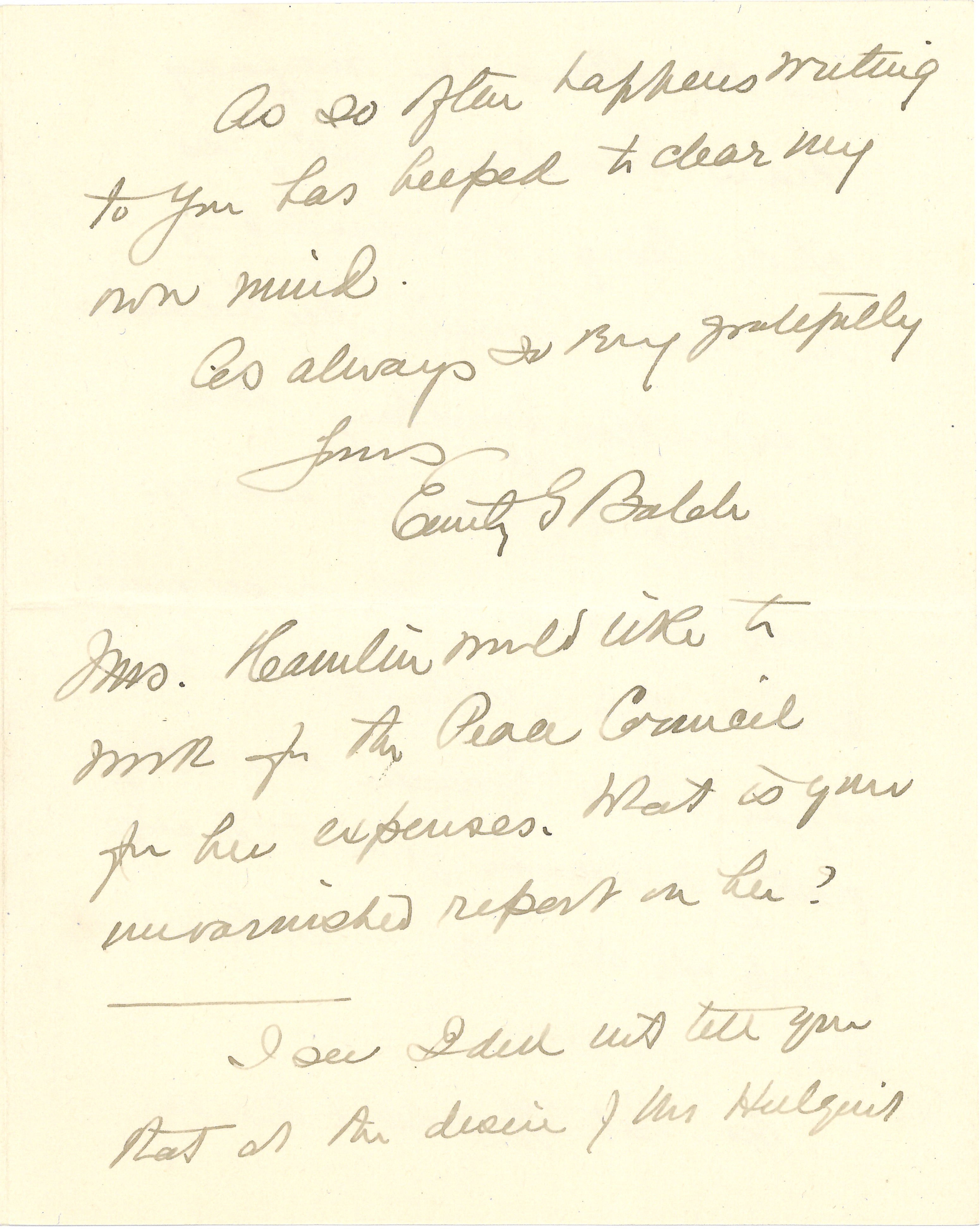 I see I did not tell you that at the desire of Mr Hillquit [page 10] and the others the Emergency Peace Federation is letting its whole being be absorbed by the Peace Council. Mr. Lochner is executive secretary, Miss Shelly is to <help> raise the money, Miss Secor is on the organizing end. It is a little hard for her. I fear Miss Freeman was away, [illegible name] is to be in go on to Chicago to help all she can -- at least that is the plan.