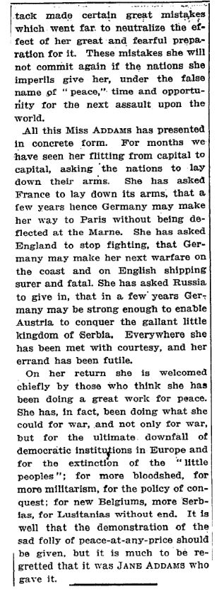 Her tour of the European Chancelleries for the purpose of urging them to make peace has been of service to the world. It has shown to all thinking persons in an objective way the weakness and silliness of those who clamor for an ending of the war on any terms, without regard to what that implies. She does not know it, but she and they have been doing what they could to bring about not peace, but war. They have been asking the democratic nations of Europe to drop their arms and give Germany time to make the next attack, warned by this experience what mistakes to avoid and how to make the next onslaught more deadly and certain. They have asked, though they do not know it, for a truce in which each nation will work feverishly for the resumption of the battle on more terrible terms. Fortunately for the world, Germany in planning her attack [page 2] made certain great mistakes which went far to neutralize the effect of her great and fearful preparation for it. These mistakes she will not commit again if the nations she imperils give her, under the false name of “peace,” time and opportunity for the next assault upon the world.