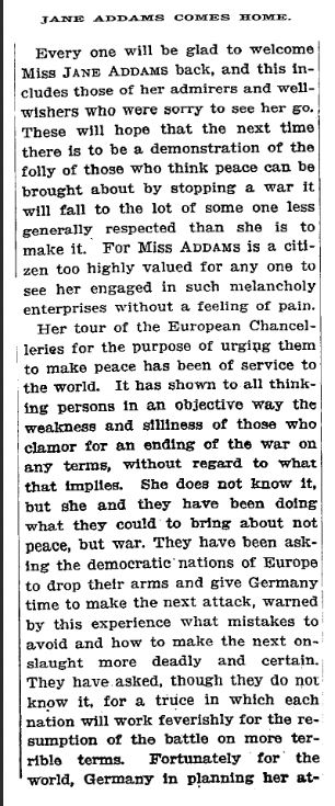 On her return she is welcomed chiefly by those who think she has been doing a great work for peace. She has, in fact, been doing what she could for war, and not only for war, but for the ultimate downfall of democratic institutions in Europe and for the extinction of the “little peoples”; for more bloodshed, for more militarism, for the policy of conquest; for new Belgiums, more Serbias, for Lusitanias without end. It is well that the demonstration of the sad folly of peace-at-any-price should be given, but it is much to be regretted that it was JANE ADDAMS who gave it.