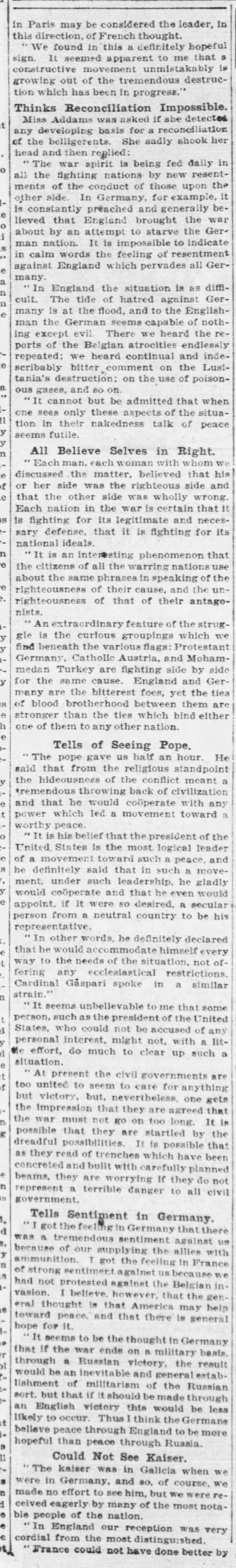 “I believe the European peoples, as a whole, are ready and anxious for peace,” she said. “This is not true of the belligerent governments, but it is true of all the peoples. They are thinking solemnly and are ready to talk seriously of it. They are readier to talk seriously of it with an American than with any one else, for reasons which are obvious. We are the greatest of the neutral nations and are of definite importance to each one of the warring powers.