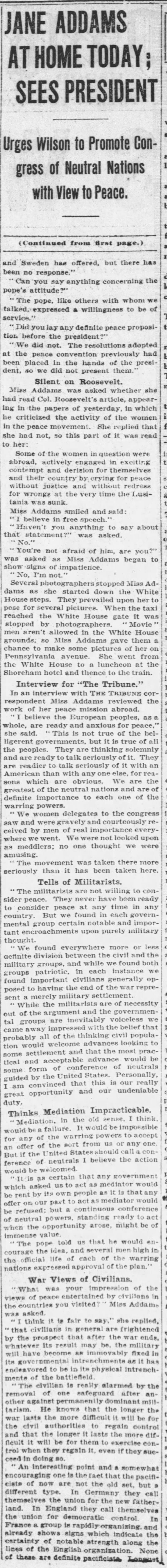Miss Addams submitted to the president no direct suggestion of steps it might be desirable for him to take in the interest of achieving the consideration of peace by the belligerents. She did, however, express the opinion that a congress of neutral nations, assembled preferably at the instance of the president of the United States, is the only agency which possibly could influence the warring powers at this time to terminate hostilities.