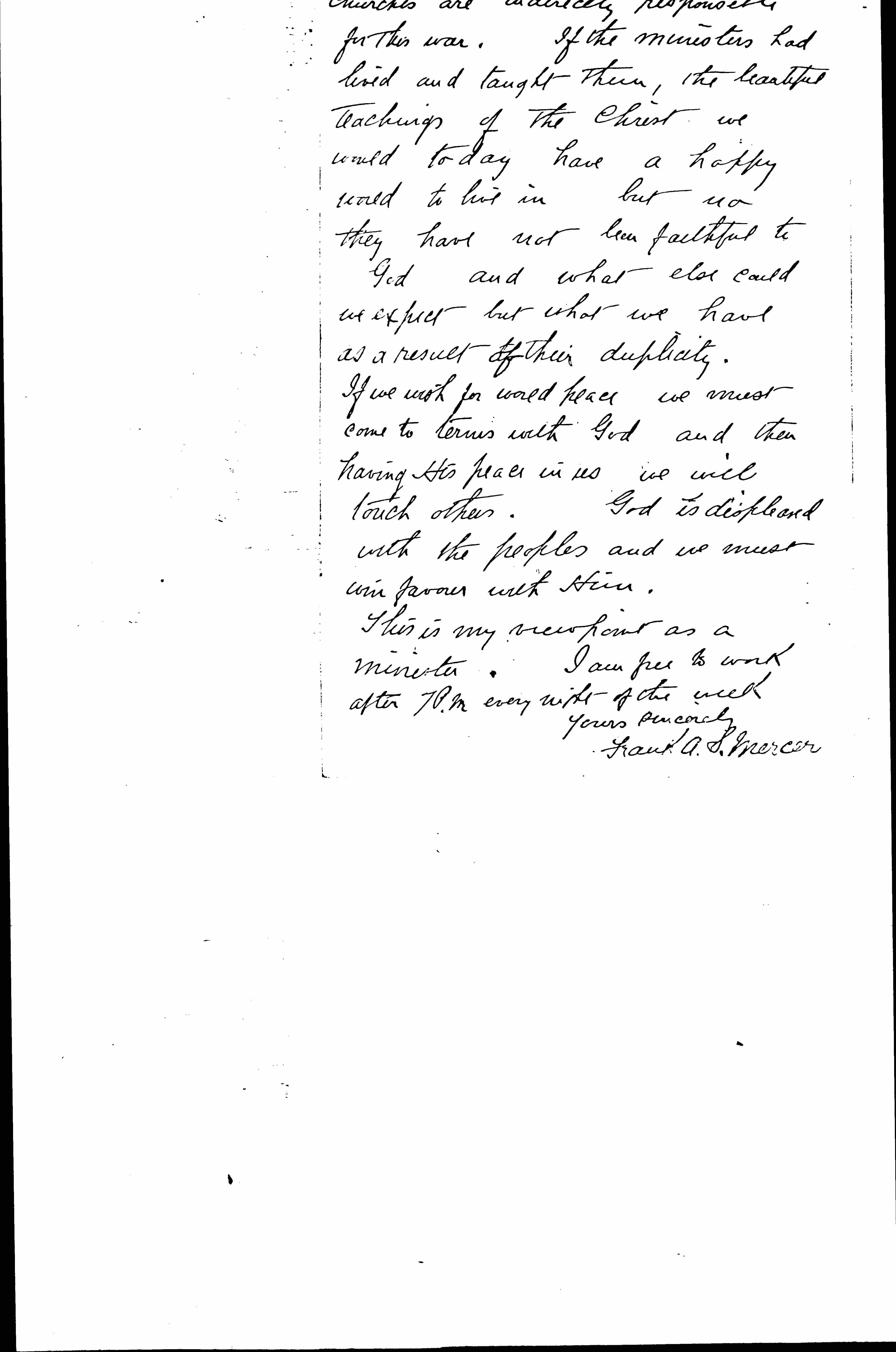 An idea occurred to me since [page 2] way to obtain results, will be by everlastingly hammering at it. Why not have a few small halls engaged by the month, hold meetings every night and we will work the people up to a state where they will demand peace. I will not be leaving Chicago, and offer my services <free,> every night if need be and will contribute all I can towards the rent of the hall. I count it a joy and privilege to do so because I know I will be serving God and my fellow men. I have been an Episcopal clergyman for over 20 years. I am not in affiliation with any church organization now.