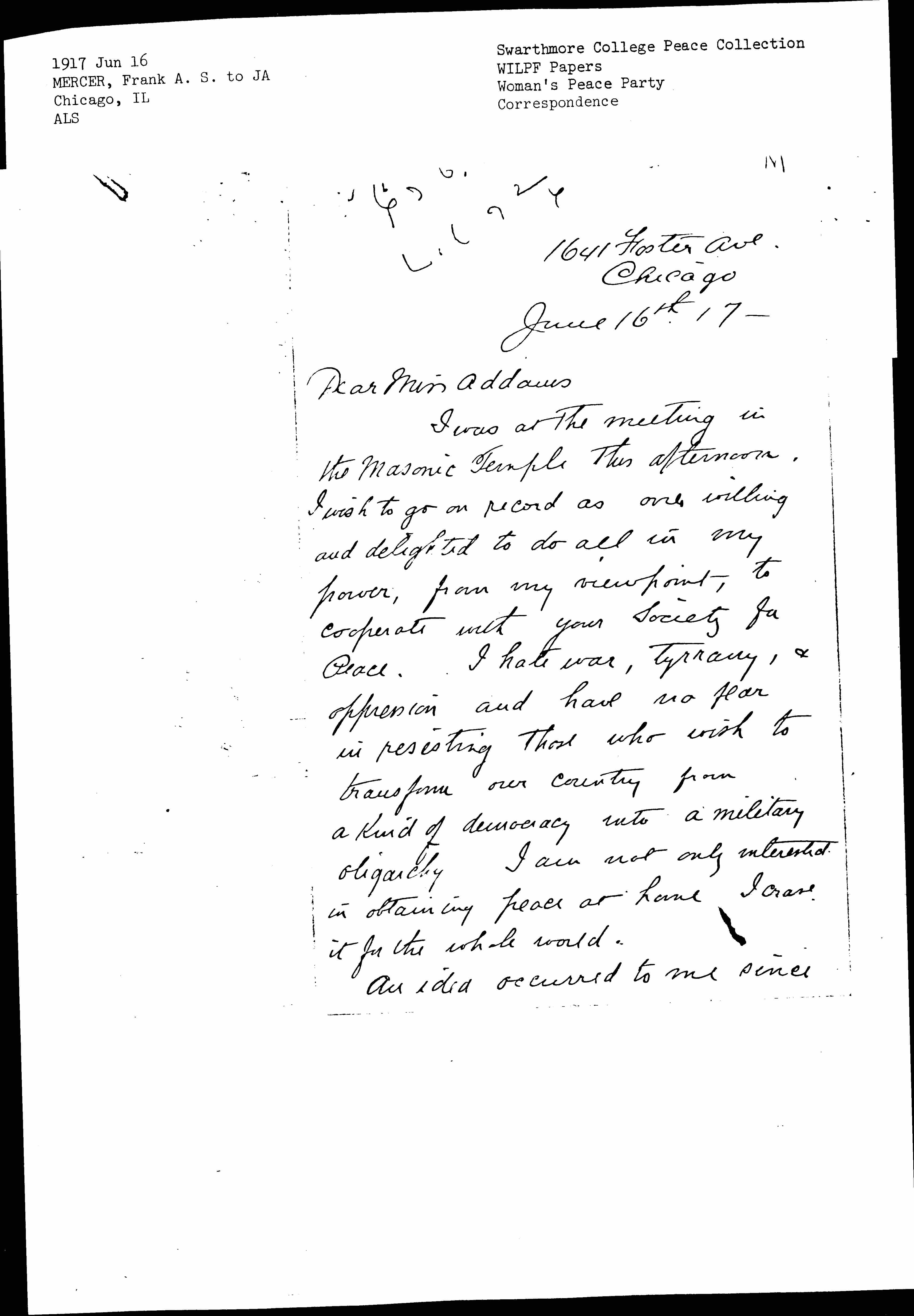 I was at the meeting in the Masonic Temple this afternoon. I wish to go on record as one willing and delighted to do all in my power, from my viewpoint, to cooperate with your Society for Peace. I hate war, [tyranny], & oppression and have no fear in resisting those who wish to transform our country from a kind of democracy into a military oligarchy. I am not only interested in obtaining peace at home I crave it for the whole world.