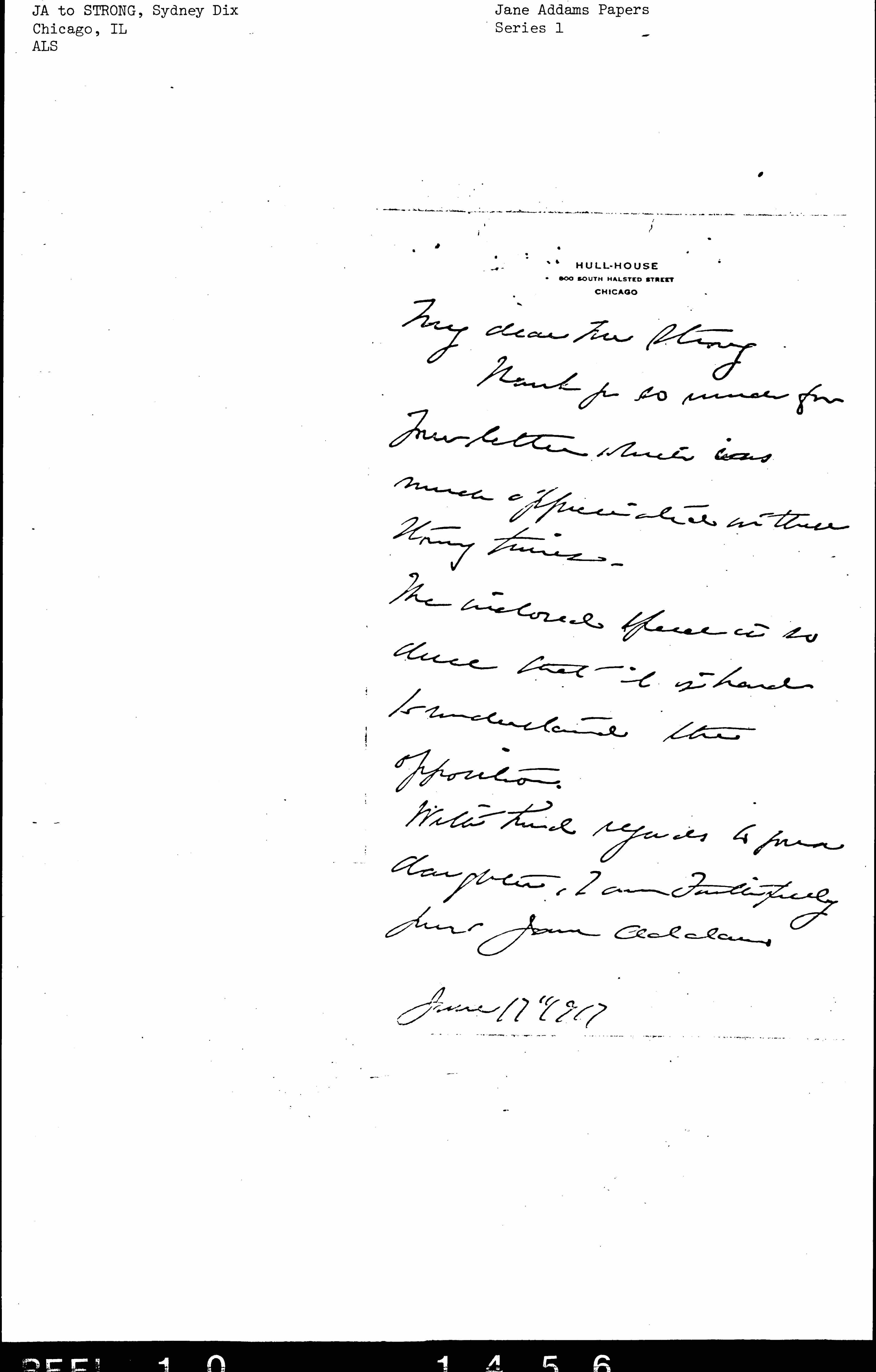 With high regards to your daughter, I am Faithfully yours Jane Addams