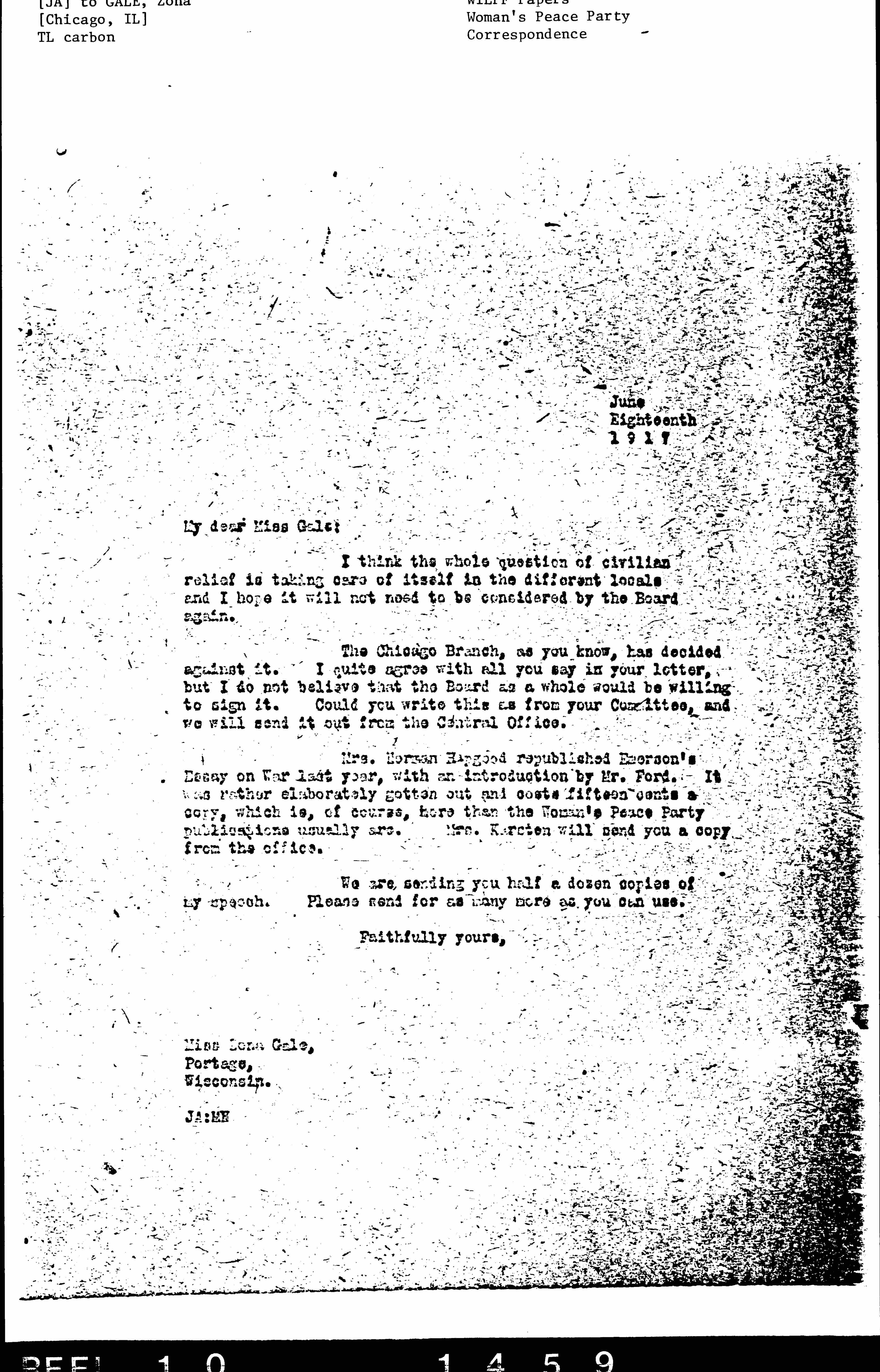 Mrs. Norman Hapgood republished Emerson's Essay on War last year, with an introduction by Mr. Ford. It was rather elaborately gotten out and costs fifteen cents a copy, which is, of course, more than the Woman's Peace Party publications usually are. Mrs. Karsten will send you a copy from the office.