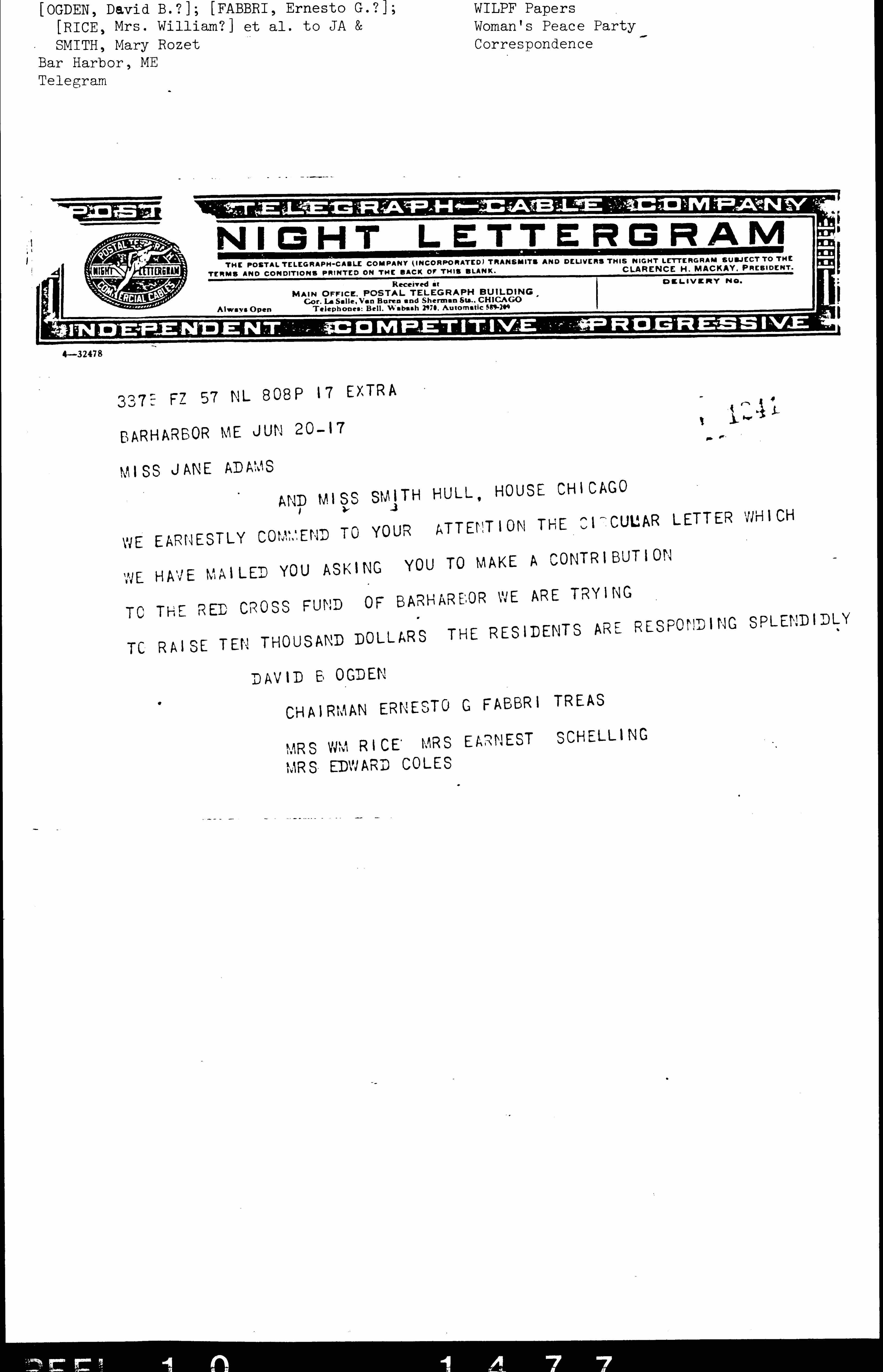 WE EARNESTLY COMMEND TO YOUR ATTENTION THE CIRCULAR LETTER WHICH WE HAVE MAILED YOU ASKING YOU TO MAKE A CONTRIBUTION TO THE RED CROSS FUND OF BAR HARBOR WE ARE TRYING TO RAISE TEN THOUSAND DOLLARS THE RESIDENTS ARE RESPONDING SPLENDIDLY