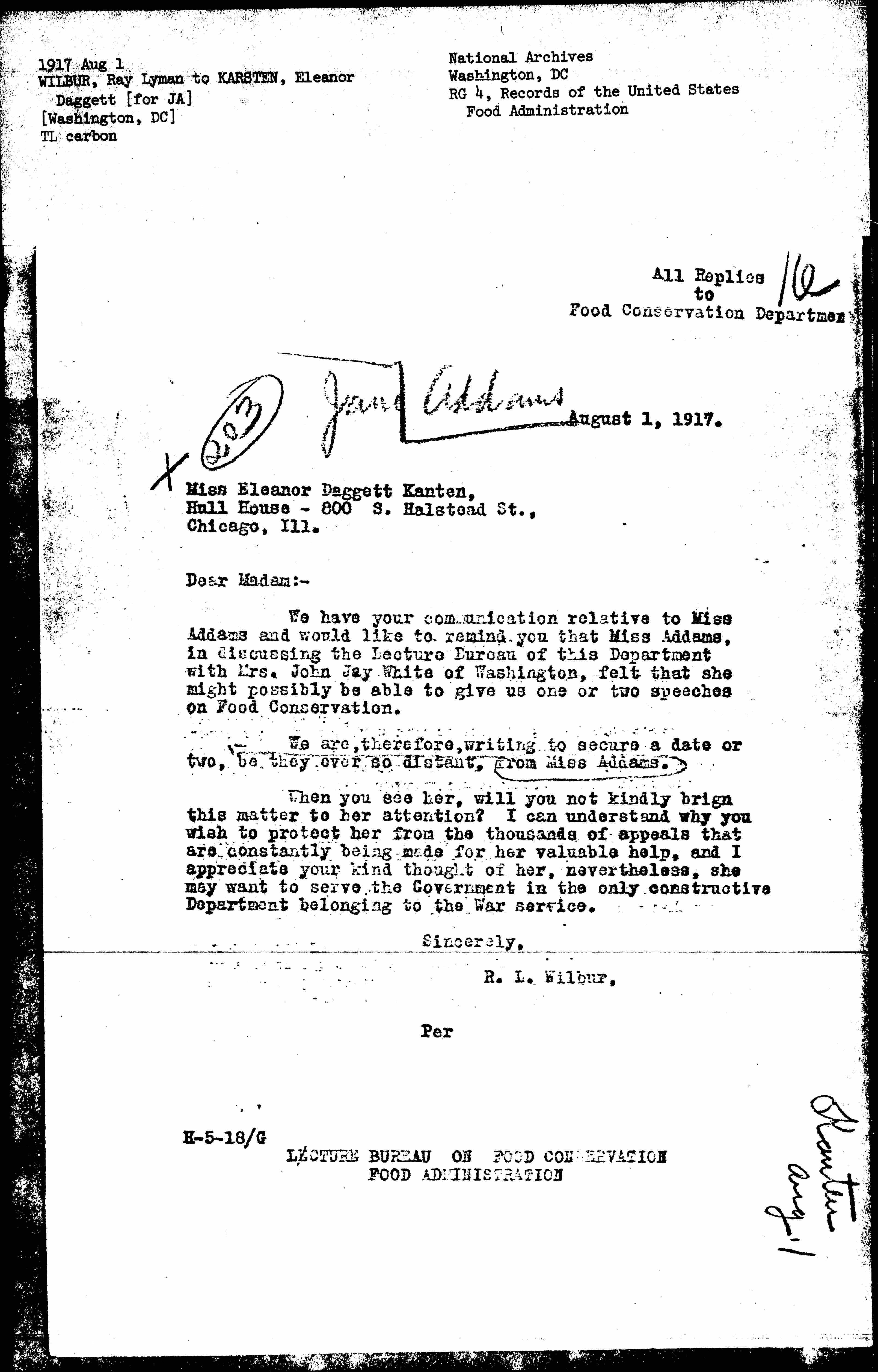 We have your communication relative to Miss Addams and would like to remind you that Miss Addams, in discussing the Lecture Bureau of this Department with Mrs. John Jay White of Washington, felt that she might possibly be able to give us one or two speeches on Food Conservation.