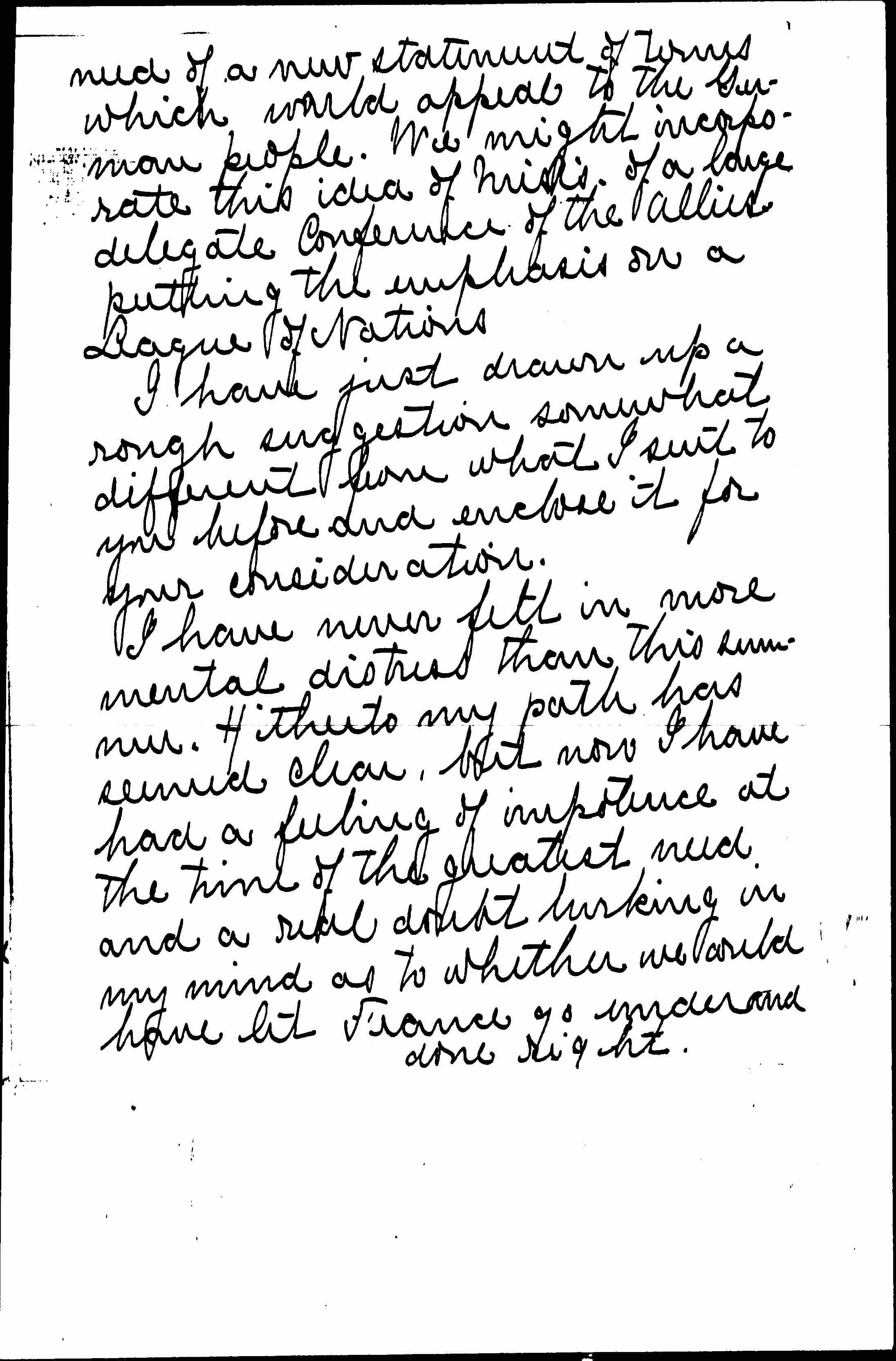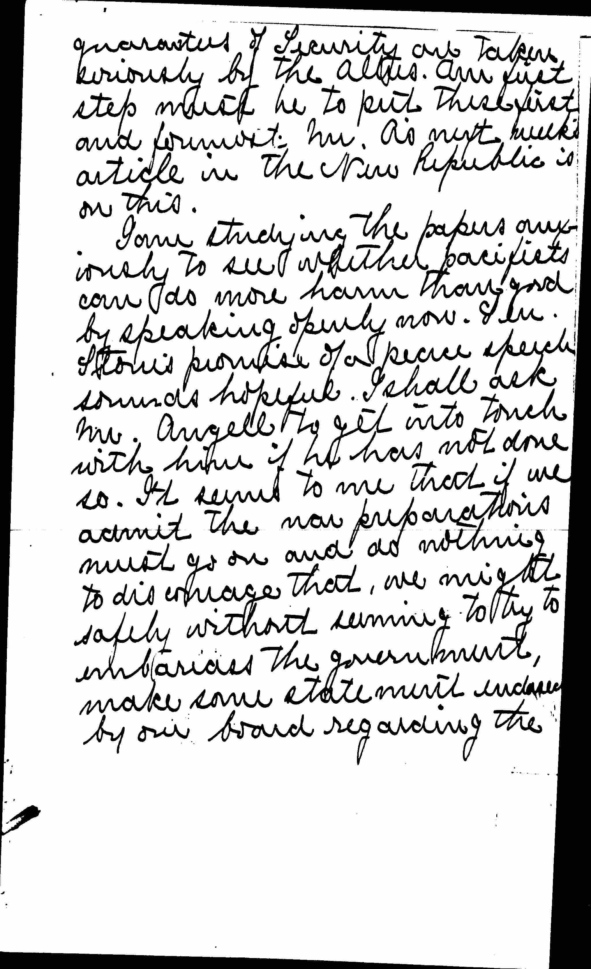 I am studying the papers anxiously to see whether pacifists can do more harm than good by speaking openly now. Sen. Stone's promise of a peace speech sounds hopeful. I shall ask Mr. Angell to get into touch with him if he has not done so. It seems to me that if we admit the war preparations must go on and do nothing to discourage that, we might safely without seeming to try to embarrass the government, make some statement [enclosed] by our board regarding the [page 3] need of a new statement of terms which would appeal to the German people. We might incorporate this idea of [illegible] of a large delegate Conference of the Allies putting the emphasis on a League of Nations.