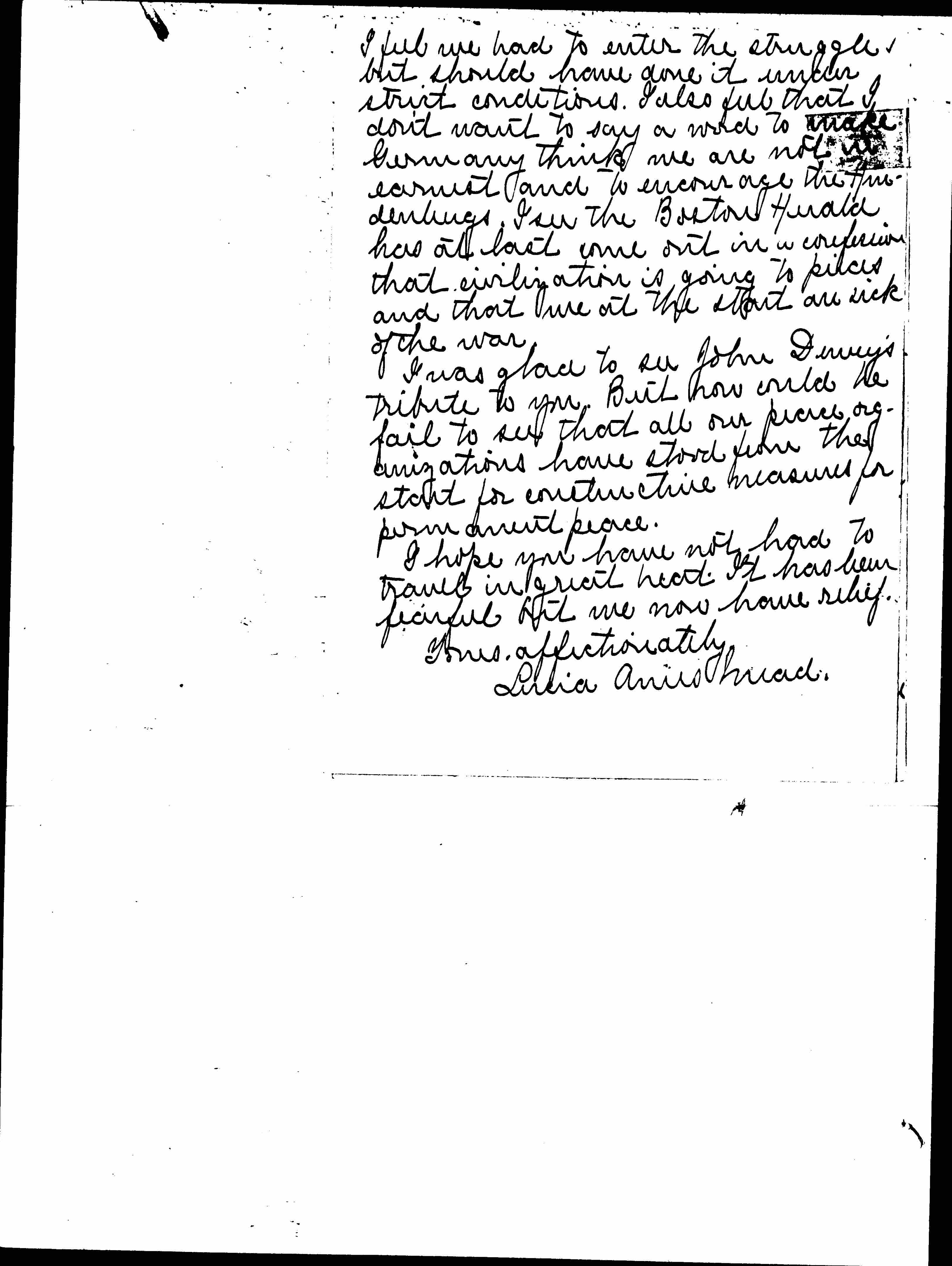 I was glad to see John Dewey's tribute to you. But how could he fail to see that all our peace organizations have stood from the start for constructive measures for permanent peace.