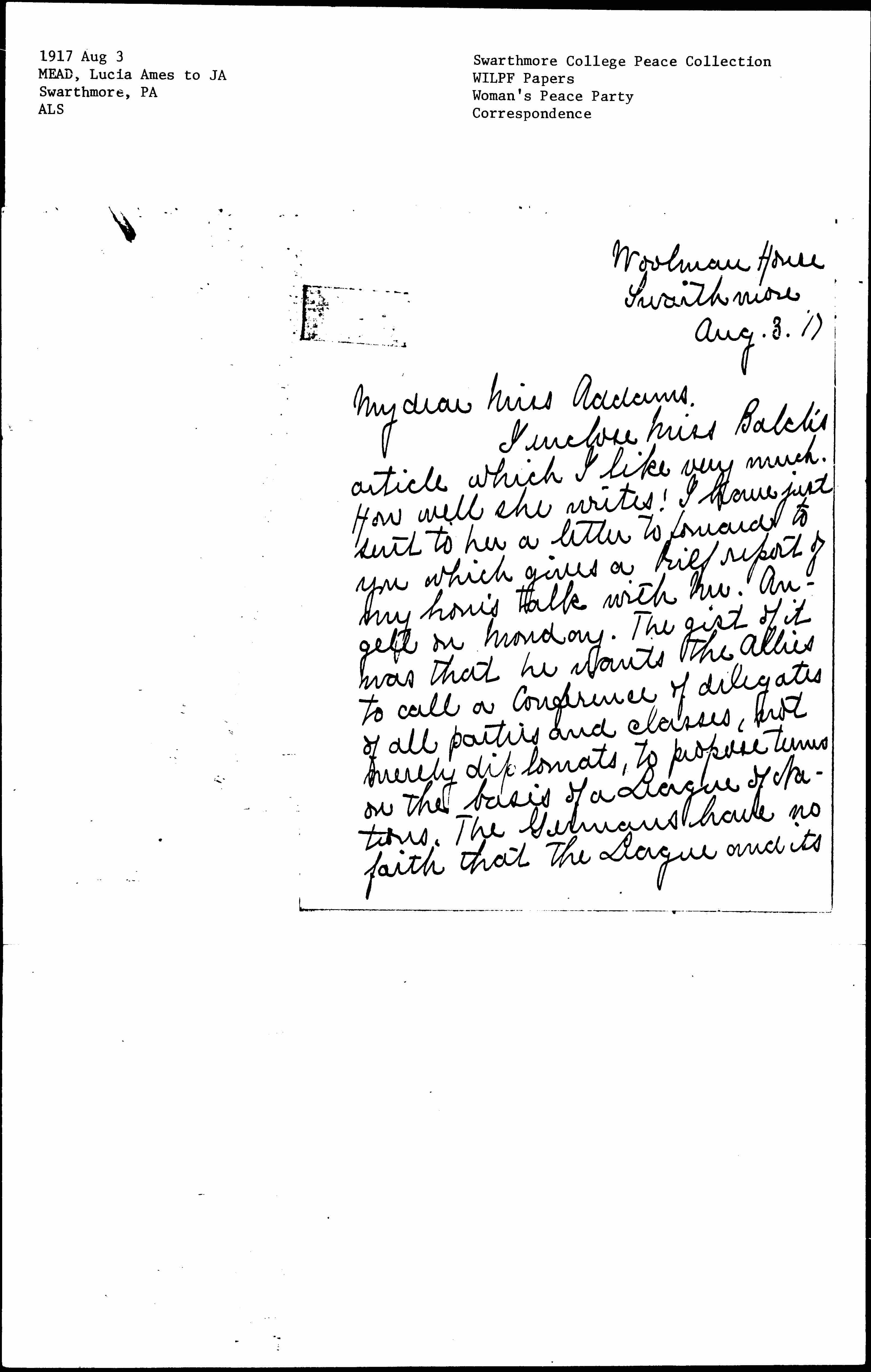I enclose Miss Balch's article which I like very much. How well she writes! I have just sent to her a letter to forward to you which gives a brief report of my hour's talk with Mr. Angell on Monday. The gist of it was that he wants the Allies to call a Conference of delegates of all parties and classes, not merely diplomats, to propose terms on the basis of a League of Nations. The Germans have no faith that the League and its [page 2] guarantees of Security are taken seriously by the Allies. Our first step must be to put these first and foremost. Mr. A's next week's article in the New Republic is on this.