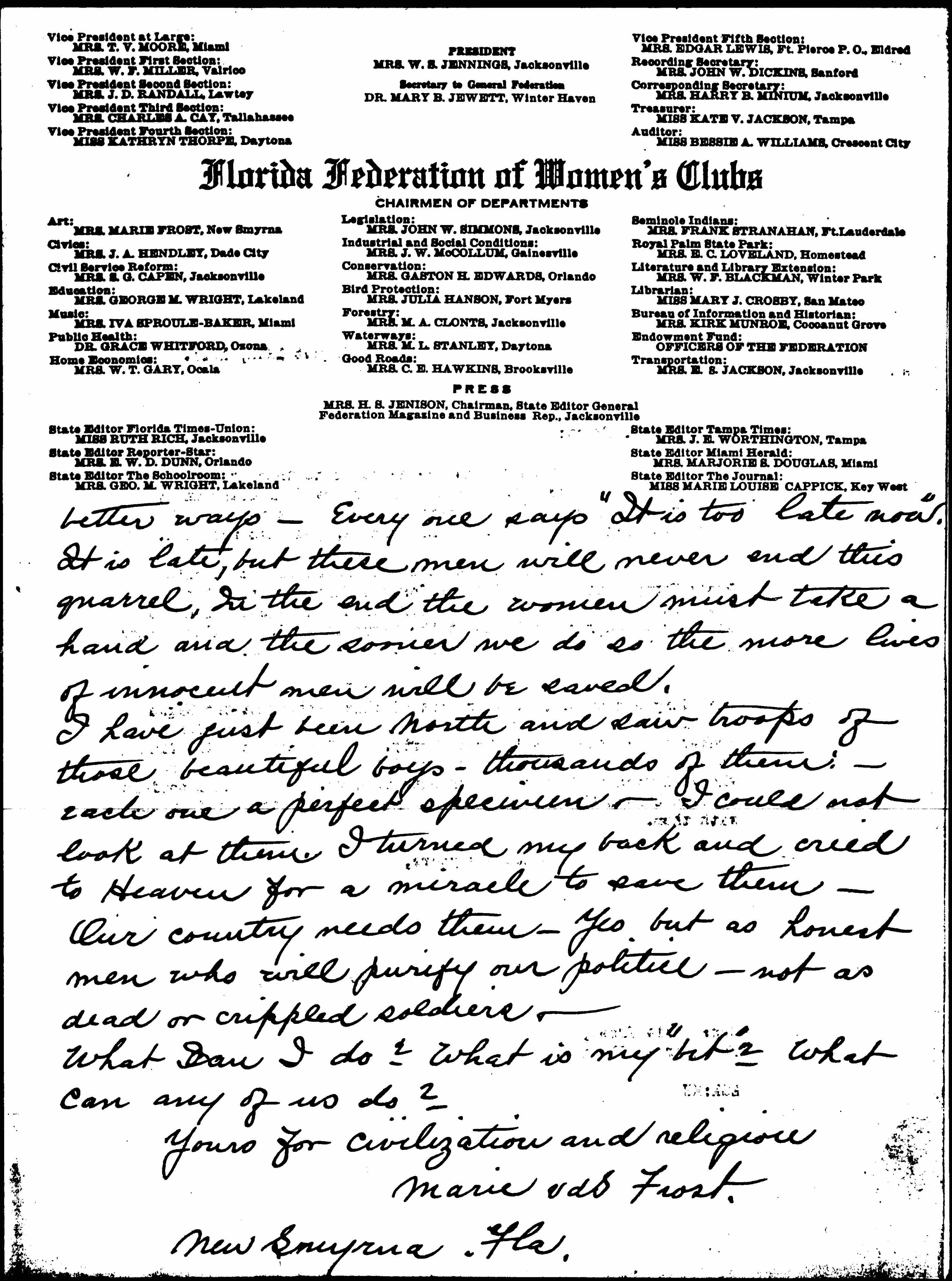 War, if it were not horrible, is so silly & illogical. Your society is probably not entering into the [page 2] partisan aspects of the case beyond the fact that we could have dealt with this question without blood shed. The world looked to us <for> high ideals and firm principles and so the nation that would restore peace to troubled lands <that> do not know how to stop although they are all ready and anxious to do so. How miserably we have failed to uphold all our fine talk about Humanity and Democracy! I am disappointed in the women of this country. They certainly should have gone on record for their religion and their homes. I believe that even now through their organization they could force an issue. If they had studied affairs and used their heads -- they might realize their power and women of other nations so sorely afflicted would also have risen -- not belligerently but tactfully, to lead the men who have forced these horrors upon us, into [page 3] better ways -- Every one says "It is too late now." It is late, but these men will never end this quarrel. In the end the women must take a hand and the sooner we do so the more lives of innocent men will be saved.