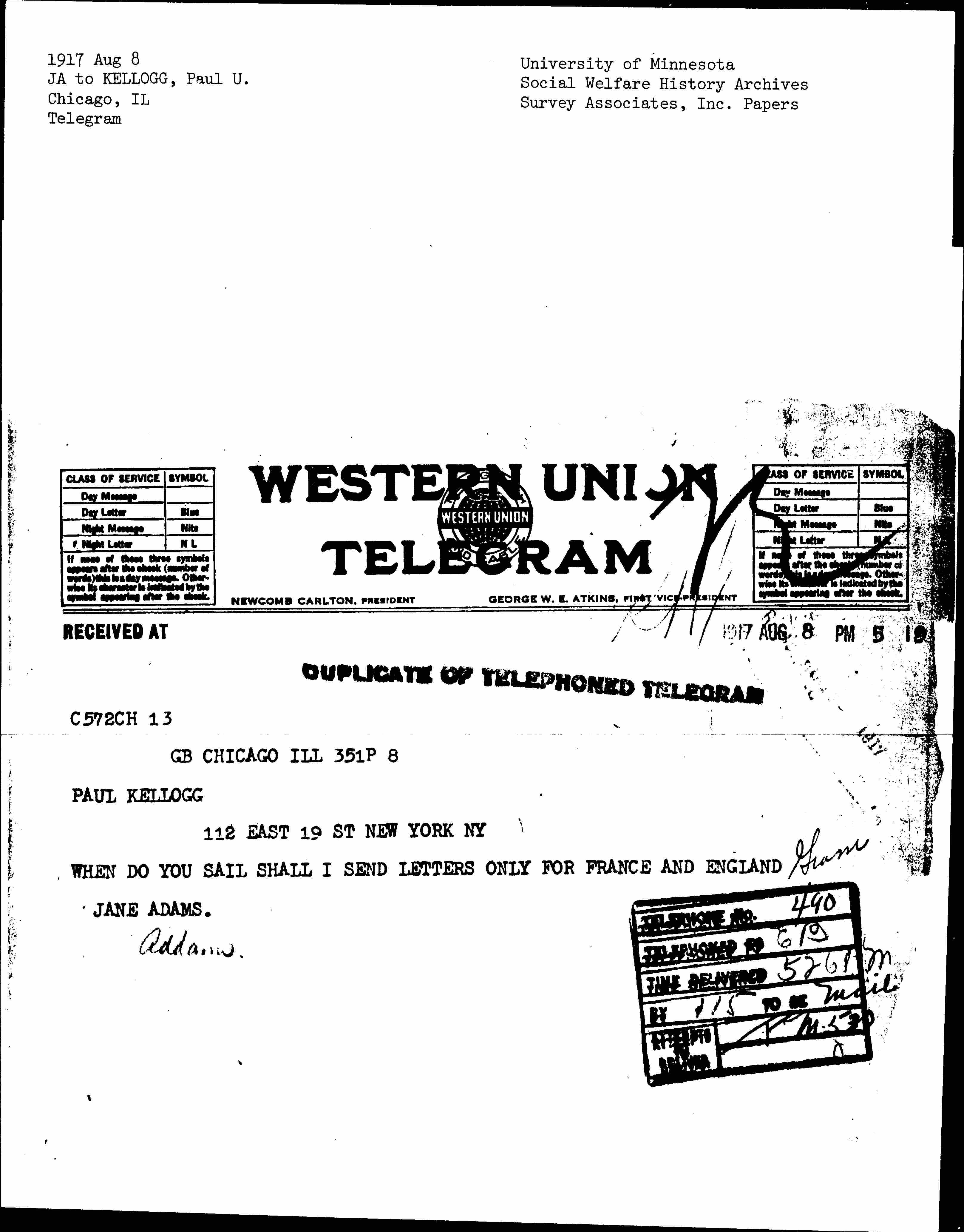 WHEN DO YOU SAIL SHALL I SEND LETTERS ONLY FOR FRANCE AND ENGLAND