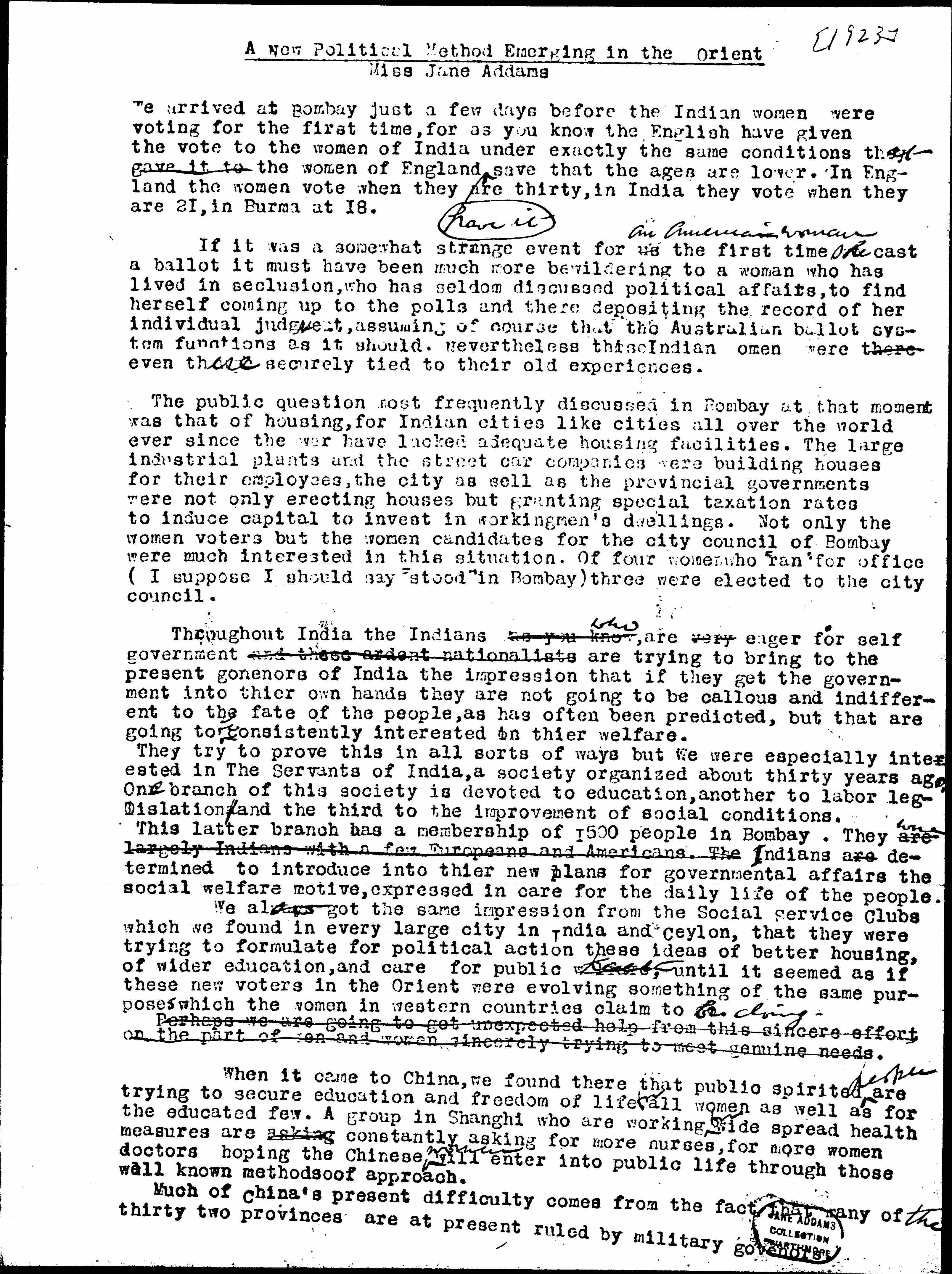 We arrived at Bombay just a few days before the Indian women were voting for the first time, for as you know the English have given the vote to the women of India under exactly the same conditions they gave it to <that> the women of England <have it> save that the ages are lower. In England the women vote when they are thirty, in India they vote when they are 21, in Burma at 18.