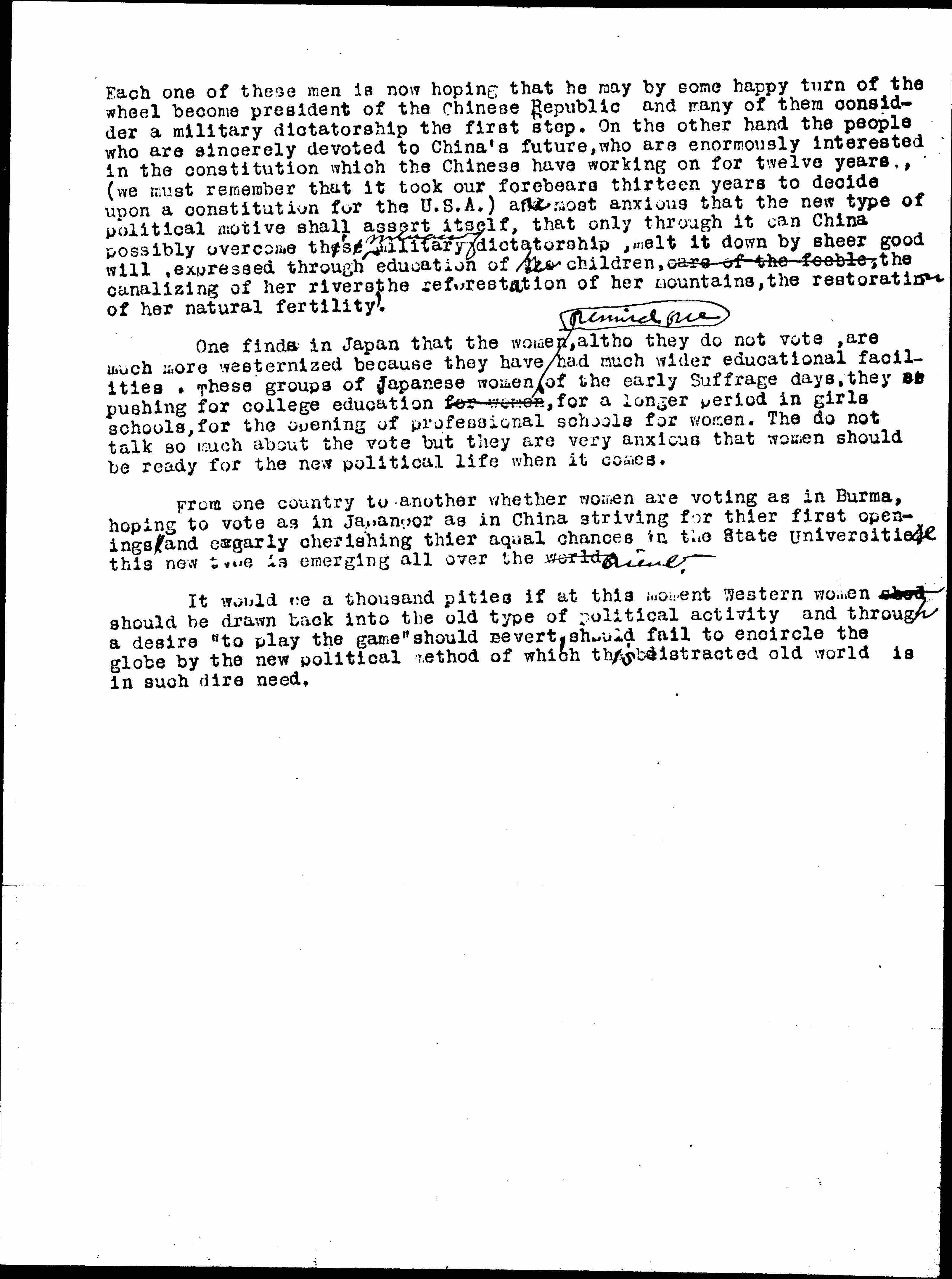 From one country to another whether women are voting as in Burma, hoping to vote as in Japan or as in China striving for their first openings and eagerly cherishing their [equal] changes in the State Universities this new tone is emerging all over the world <Orient>.