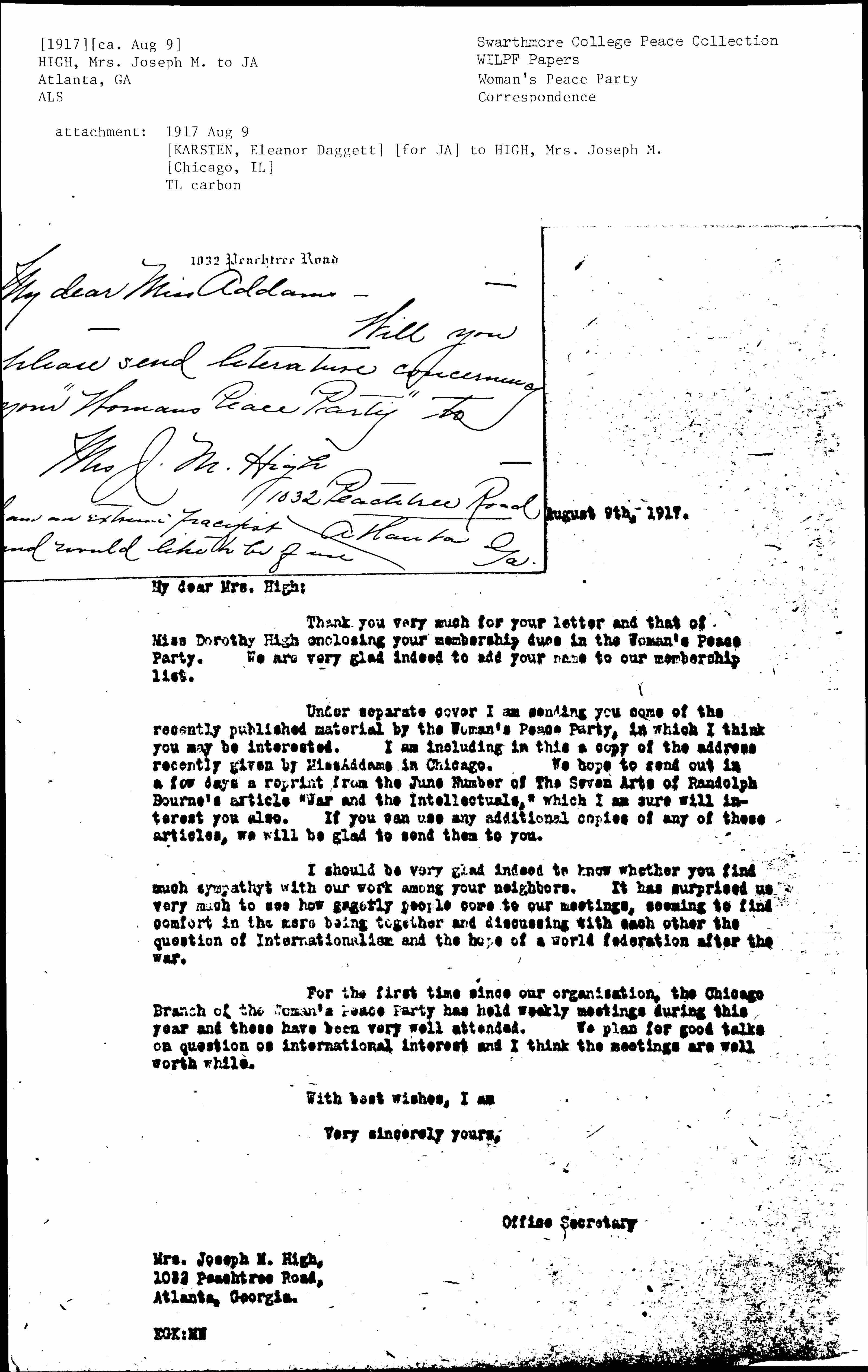 Thank you very much for your letter and that of Miss Dorothy High enclosing your membership dues in the Woman's Peace Party. We are very glad indeed to add your name to our membership list.