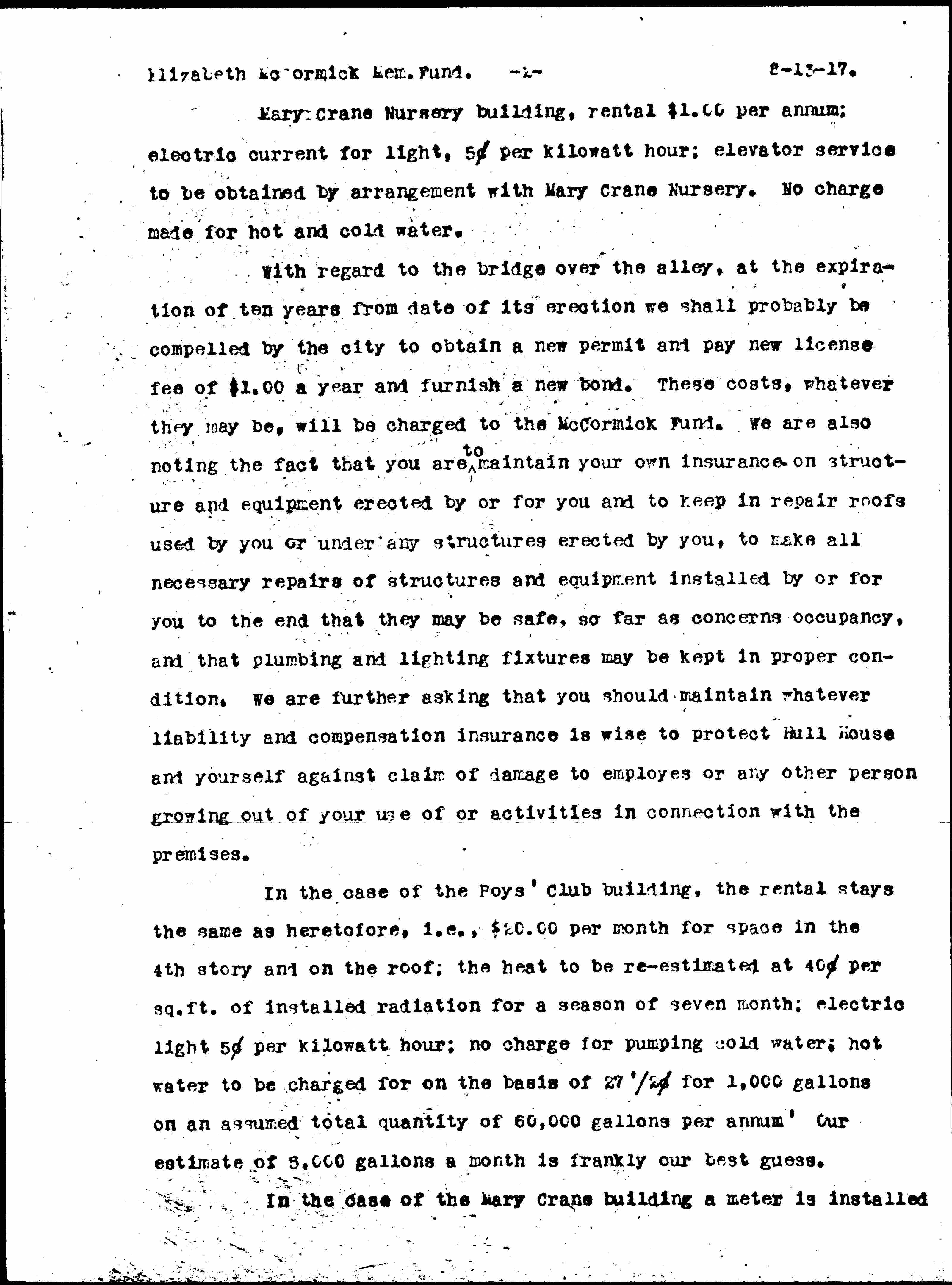 With regard to the bridge over the alley, at the expiration of ten years from date of its erection we shall probably be compelled by the city to obtain a new permit and pay new license fee of $1.00 a year and furnish a new bond. These costs, whatever they may be, will be charged to the McCormick Fund. We are also noting the fact that you are <to> maintain your own insurance on structure and equipment erected by or for you and to keep in repair roofs used by you or under any structures erected by you, to make all necessary repairs of structures and equipment installed by or for you to the end that they may be safe, so far as concerns occupancy, and that plumbing and lighting fixtures may be kept in proper condition. We are further asking that you should maintain whatever liability and compensation insurance is wise to protect Hull House and yourself against claim of damage to [employees] or any other person growing out of your use of or activities in connection with the premises.