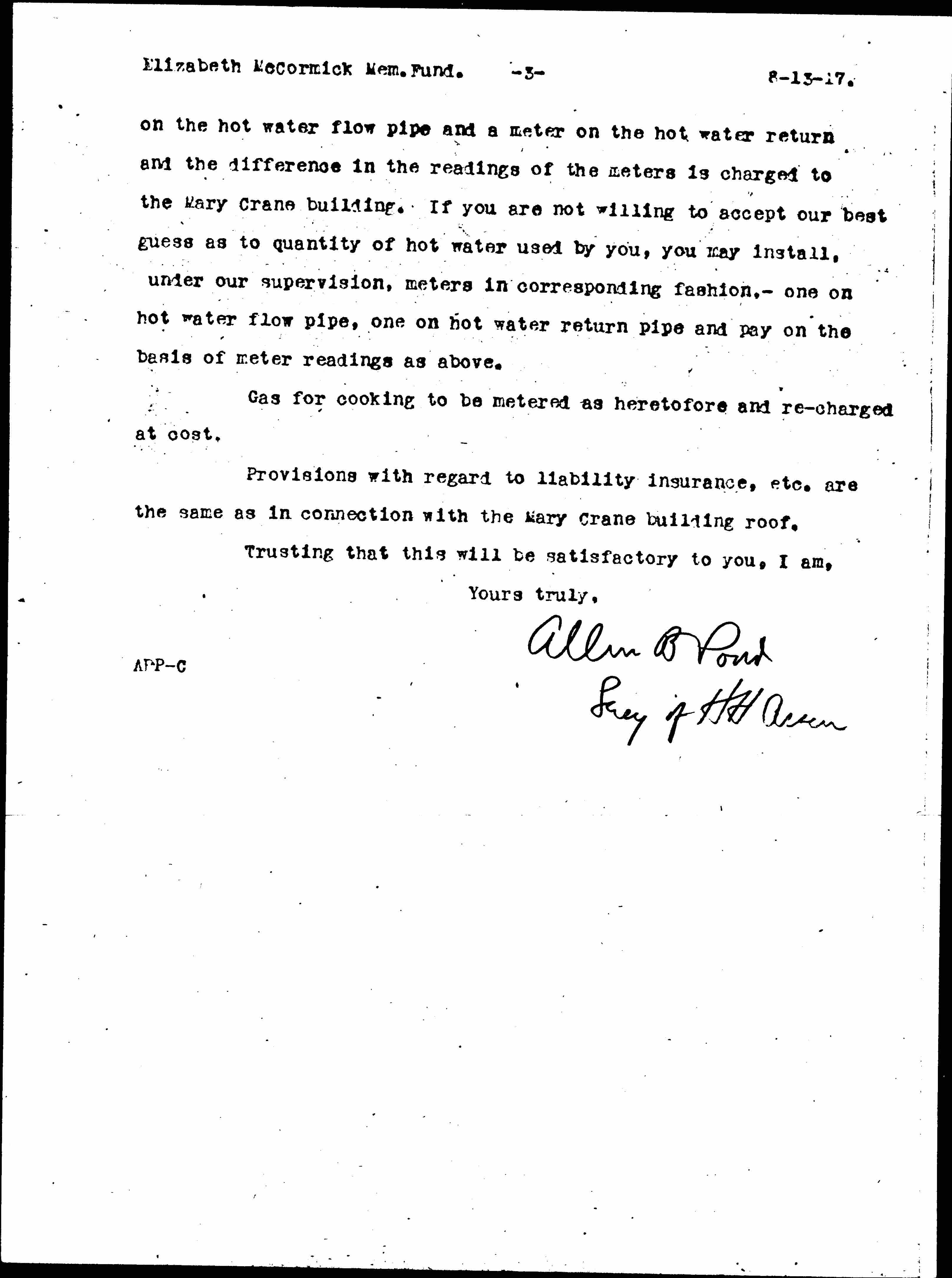 In the case of the Mary Crane building a meter is installed [page 3] on the hot water flow pipe and a meter on the hot water return and the difference in the readings of the meters is charged to the Mary Crane building. If you are not willing to accept our best guess as to quantity of hot water used by you, you may install, under our supervision, meters in corresponding fashion, -- one on hot water flow pipe, one on hot water return pipe and pay on the basis of meter readings as above.