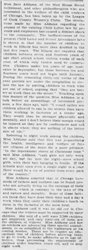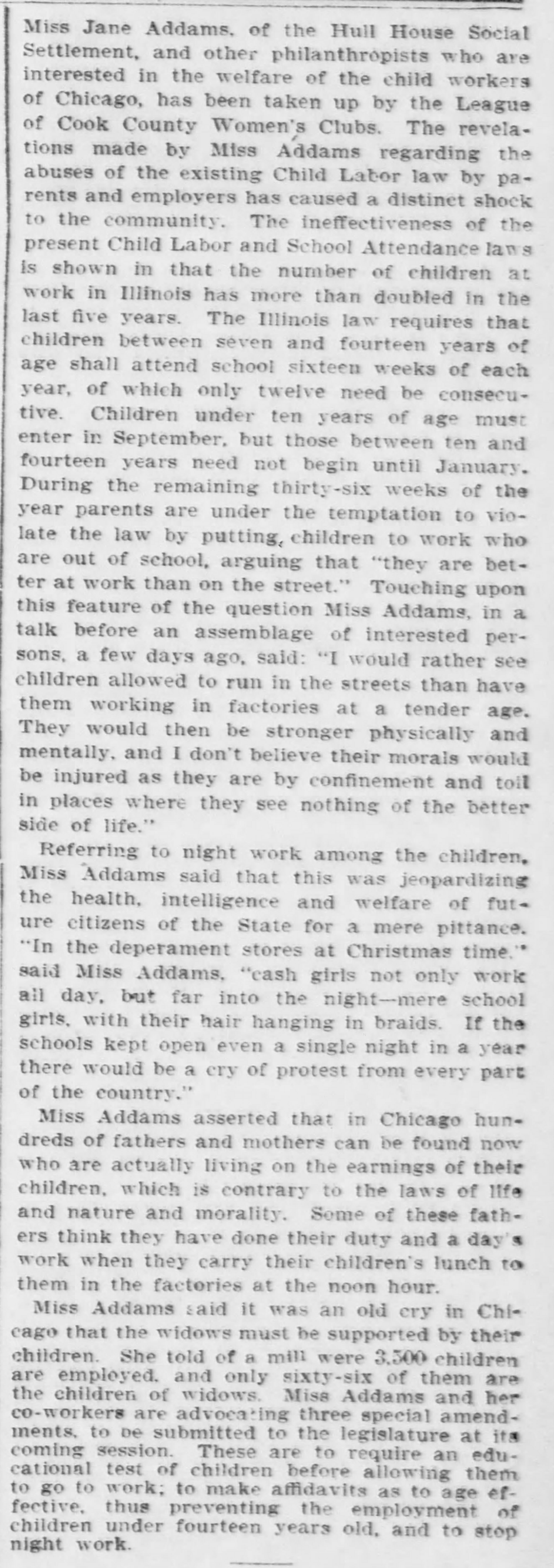 Referring to night work among the children, Miss Addams said that this was jeopardizing the health, intelligence and welfare of future citizens of the State for a mere pittance. "In the [department] stores at Christmas time," said Miss Addams, "cash girls not only work all day, but far into the night -- mere school girls, with their hair hanging in braids. If the schools kept open even a single night in a year there would be a cry of protest from every part of the country."