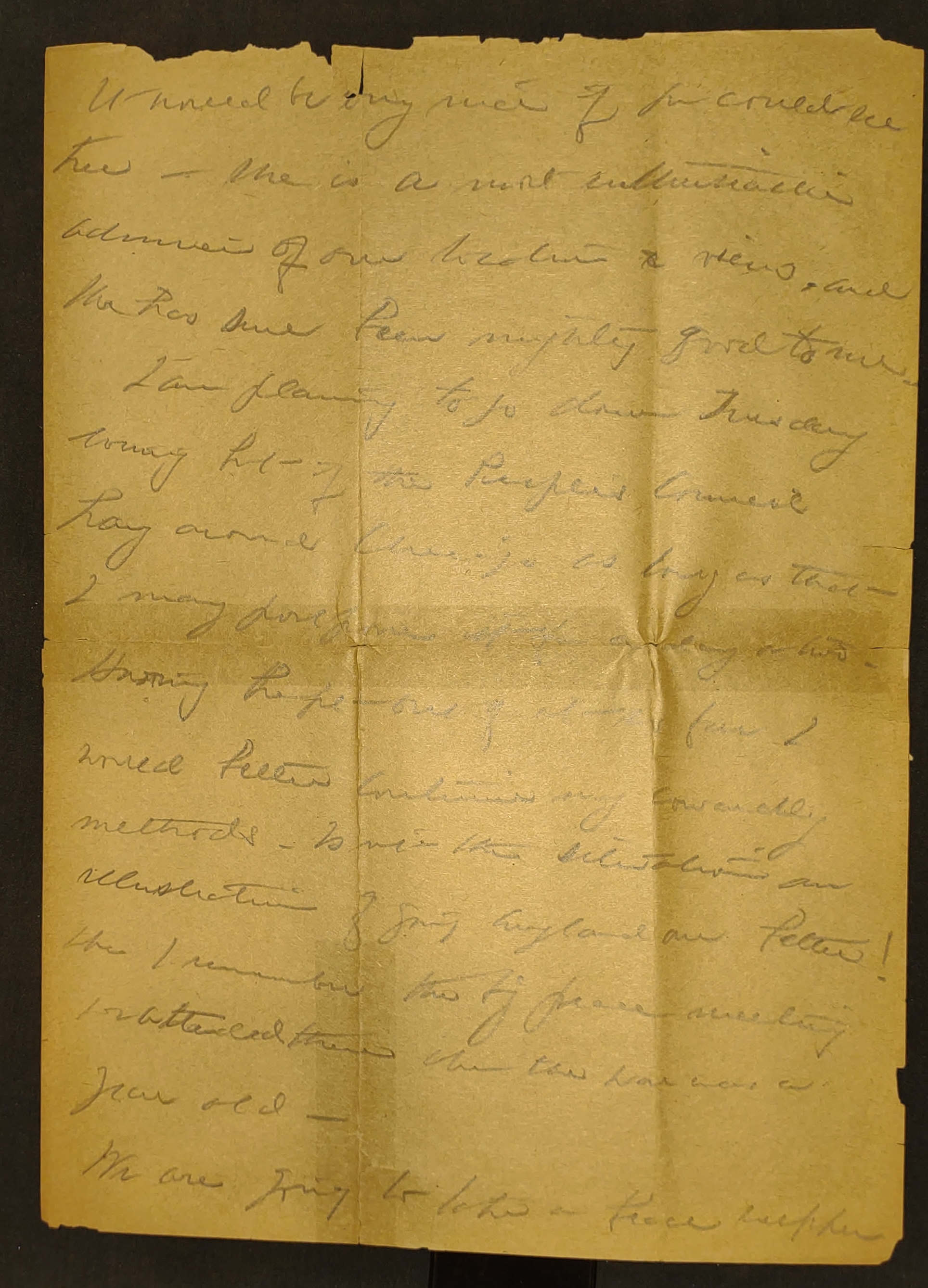 I am really having the best kind of a time and have become very fond of Edith Hamilton -- keep the news from Marcet! -- who leaves for the east today. She goes directly to see Mrs Reid at Seal Harbor. [page 2] It would be very nice if you could see her -- she is a most enthusiastic admirer of our location & views, and she has sure been mighty good to me.