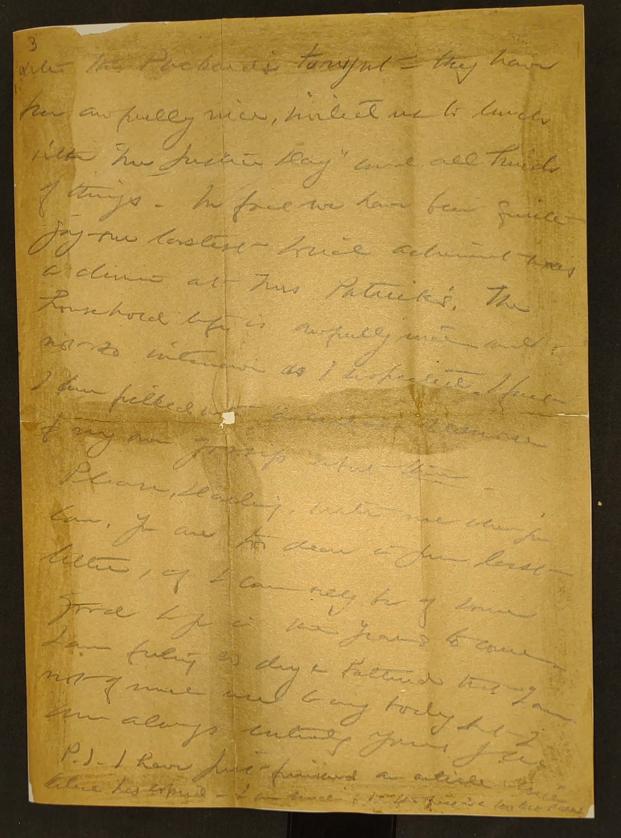 We are going to take a Peace supper [page 3] with the Packards tonight -- they have been awfully nice, invited us to lunch with "Mr Justice Day" and all kinds of things. In fact we have been quite gay -- our lastest social achievement was a dinner at Mrs Patrick's. The household life is awfully nice and not so intensive as I suspected. [In] fact I am filled with a certain remorse for my own gossip about them.