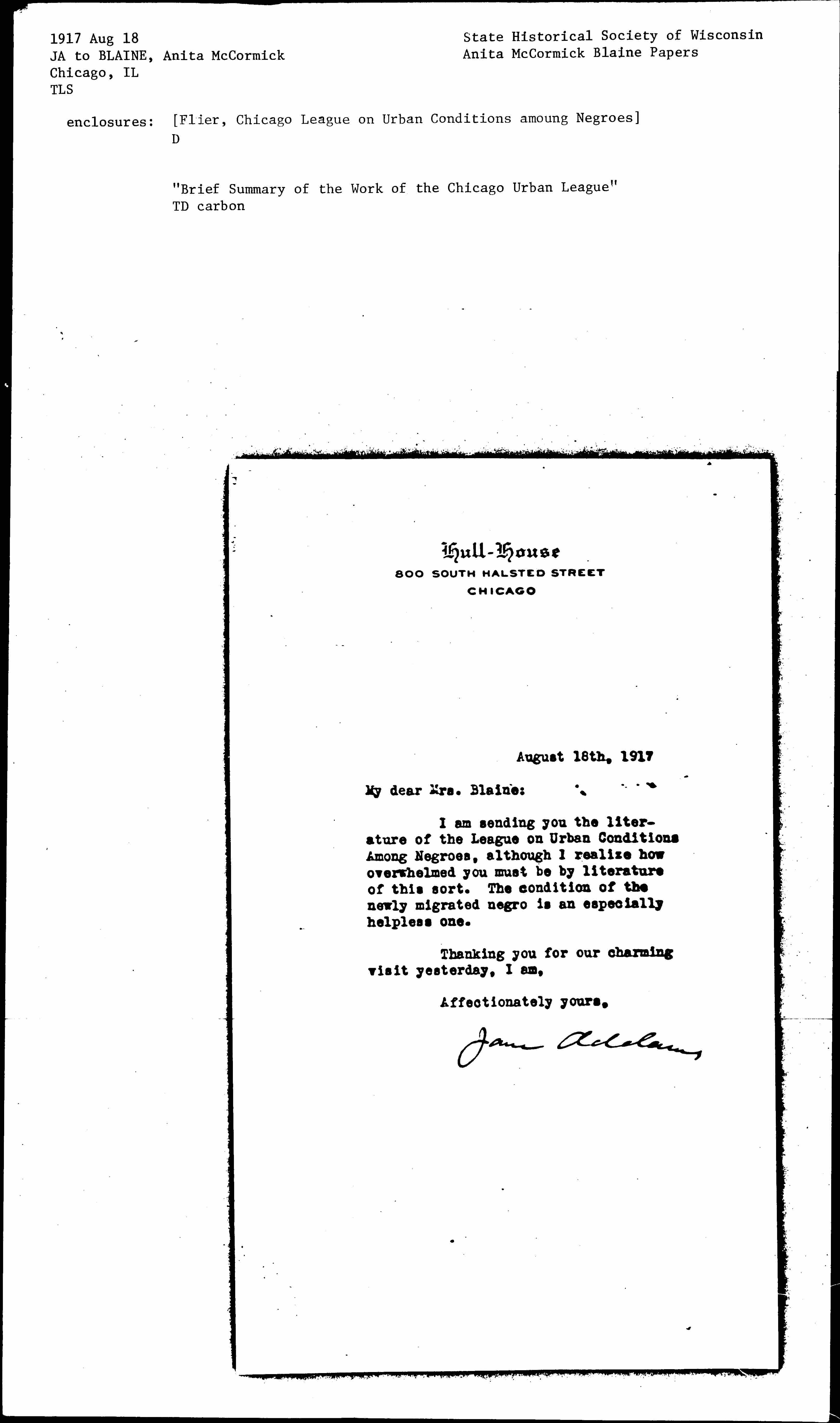 I am sending you the literature of the League on Urban Conditions Among Negroes, although I realize how overwhelmed you must be by literature of this sort. The condition of the newly migrated negro is an especially helpless one.