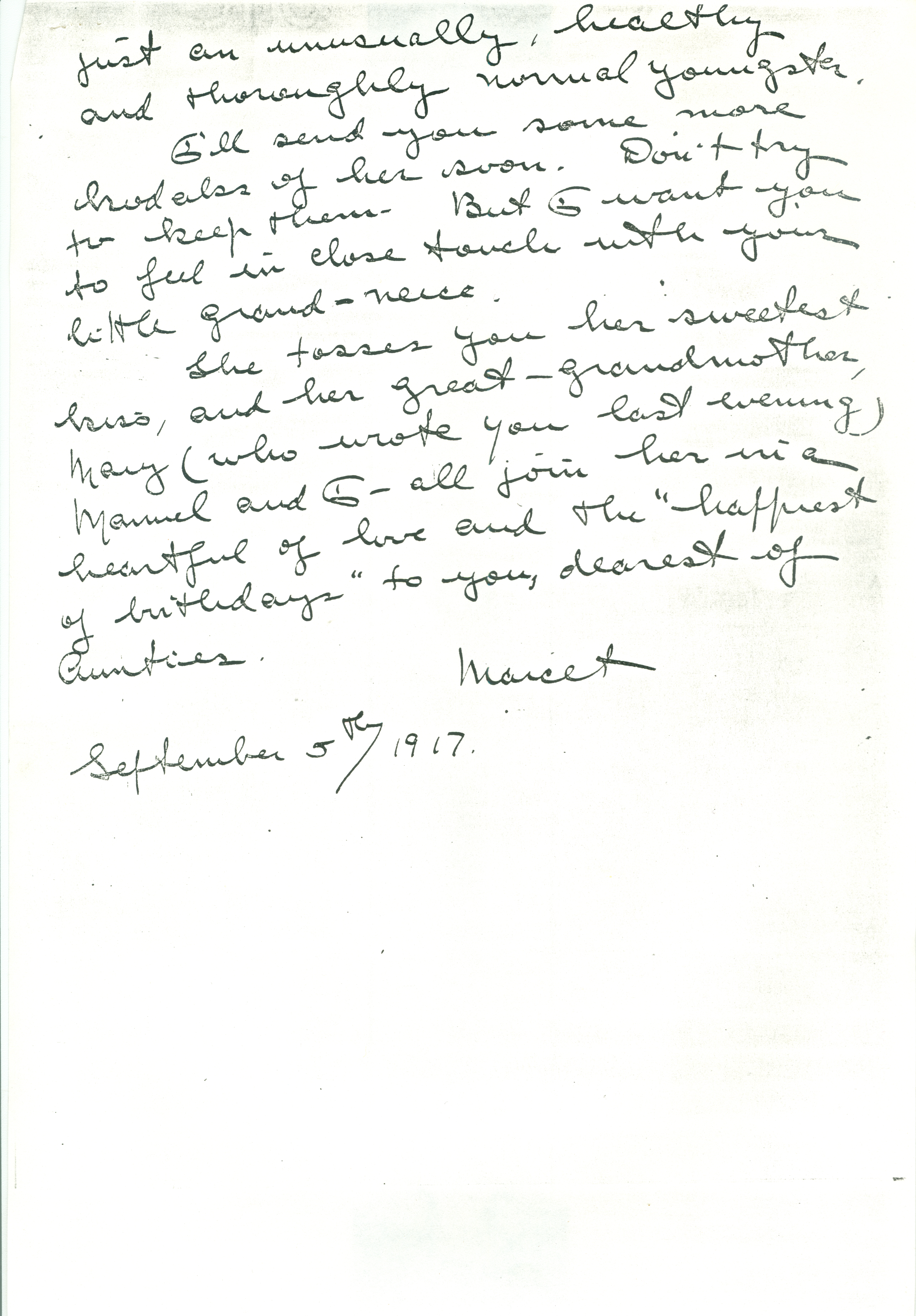 She tosses you her sweetest kiss, and her great-grandmother, Mary (who wrote you last evening) Manuel and I -- all join her in a heartful of love and the "happiest of birthdays" to you, dearest of Aunties.