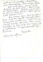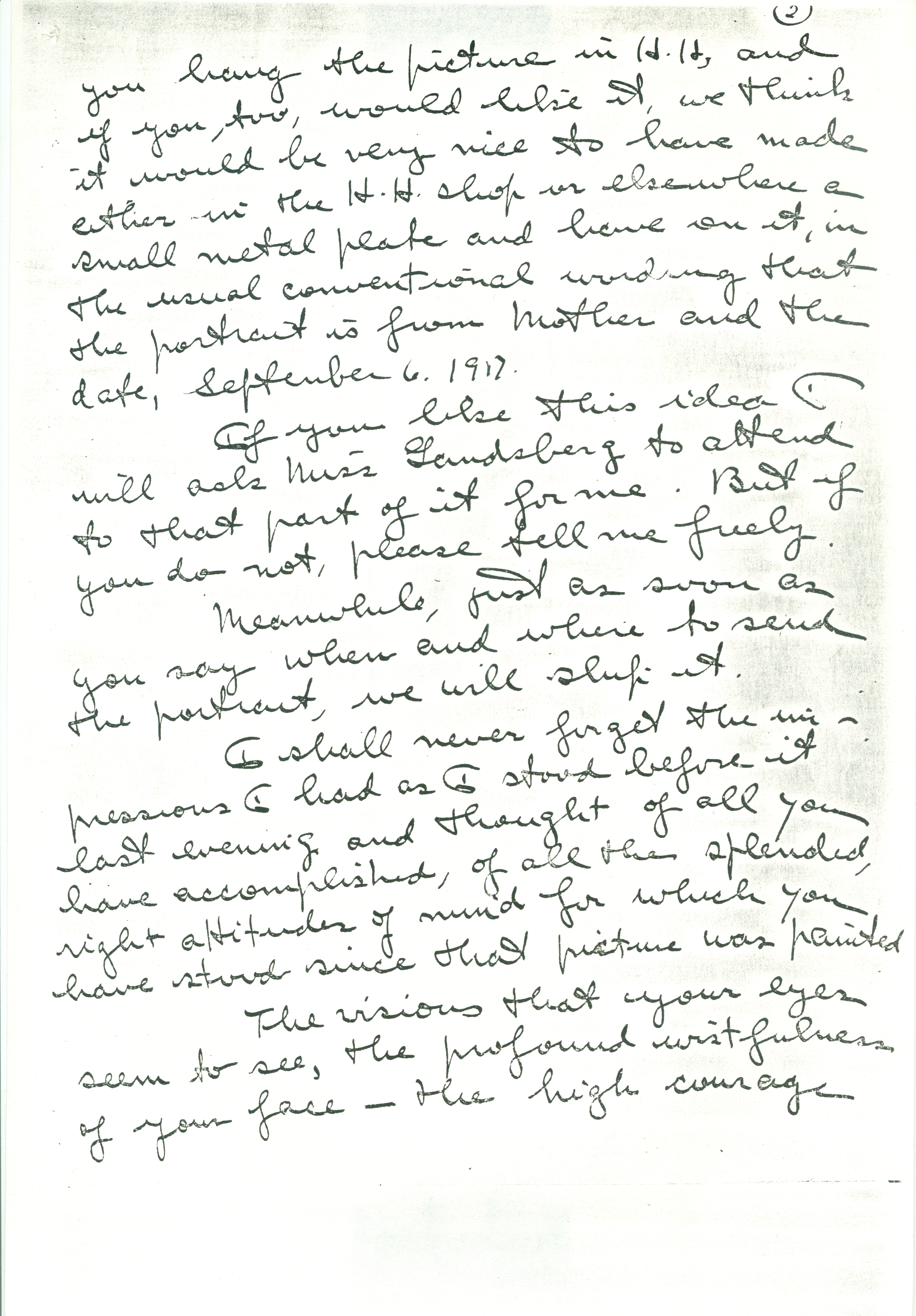 If it is in good taste, and if [page 2] you hang the picture in H.H, and if you, too, would like it, we think it would be very nice to have made either in the H.H. shop or elsewhere a small metal plate and have on it, in the usual conventional wording that the portrait is from Mother and the date, September 6. 1917.