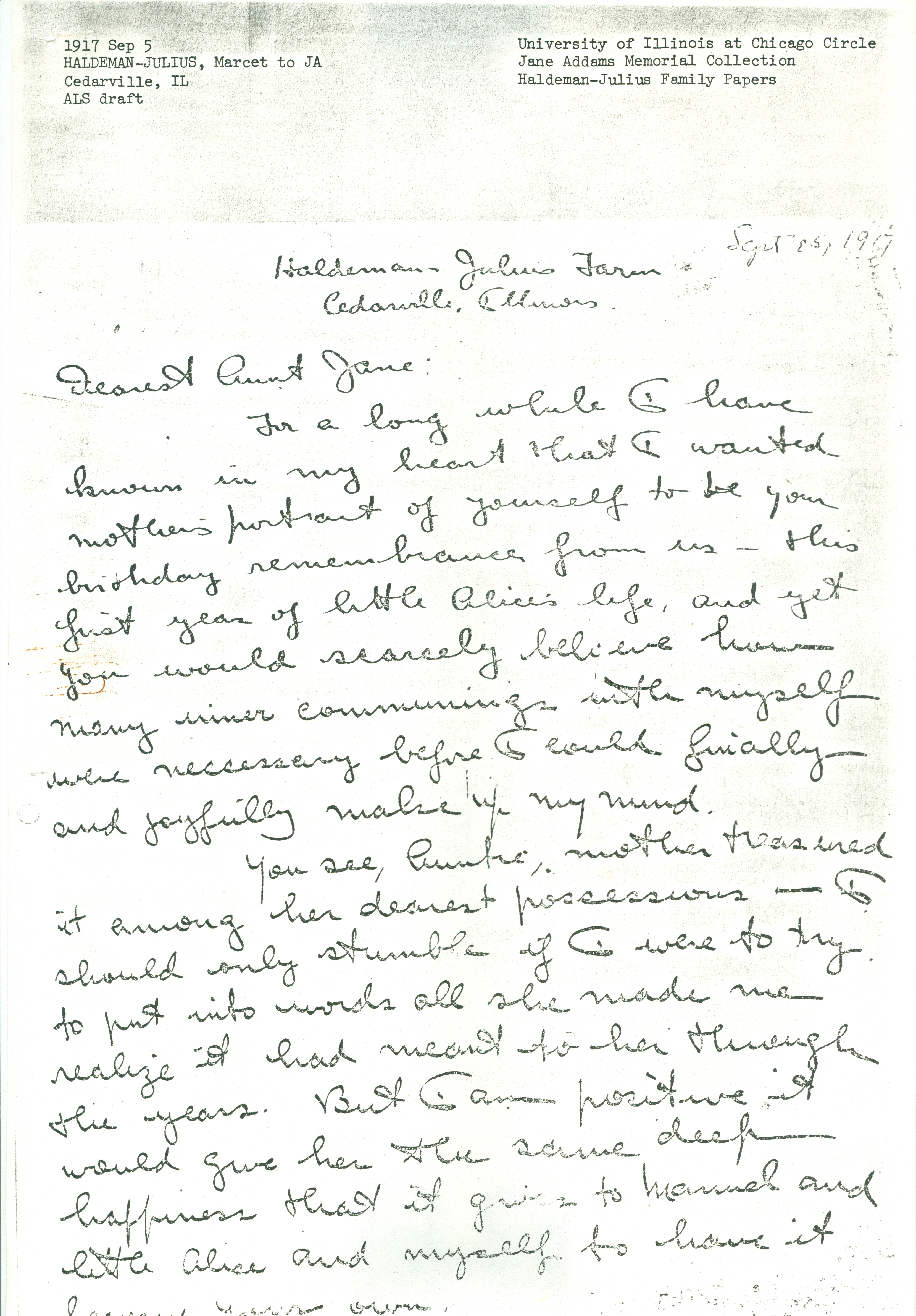 I'll send you some more Kodaks of her soon. Don't try to keep them. But I want you to feel in close touch with your little [grand-niece].