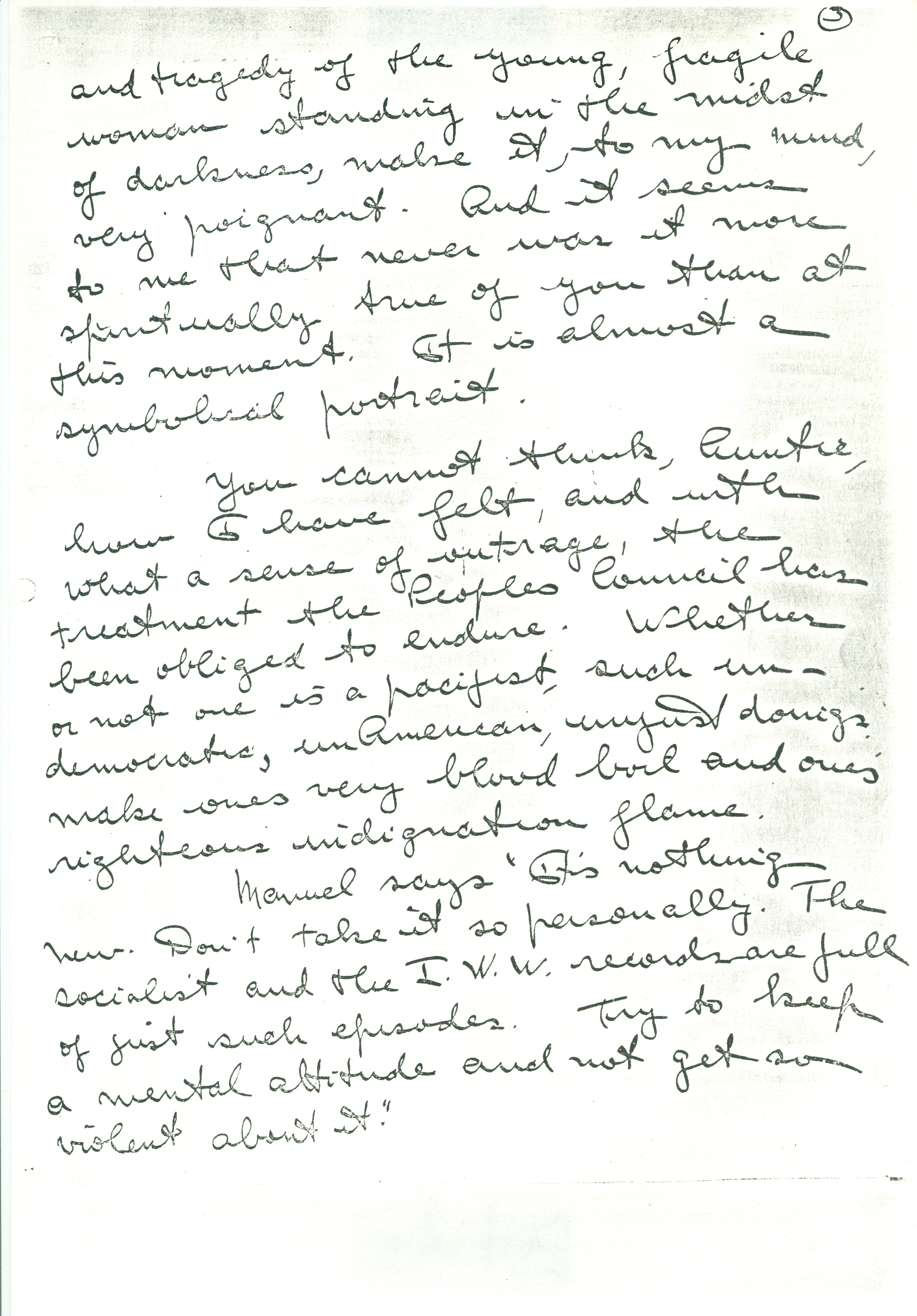 Manuel says "It's nothing new. Don't take it so personally. The socialist and the I.W.W. records are full of just such episodes. Try to keep a mental attitude and not get so violent about it." [page 4]