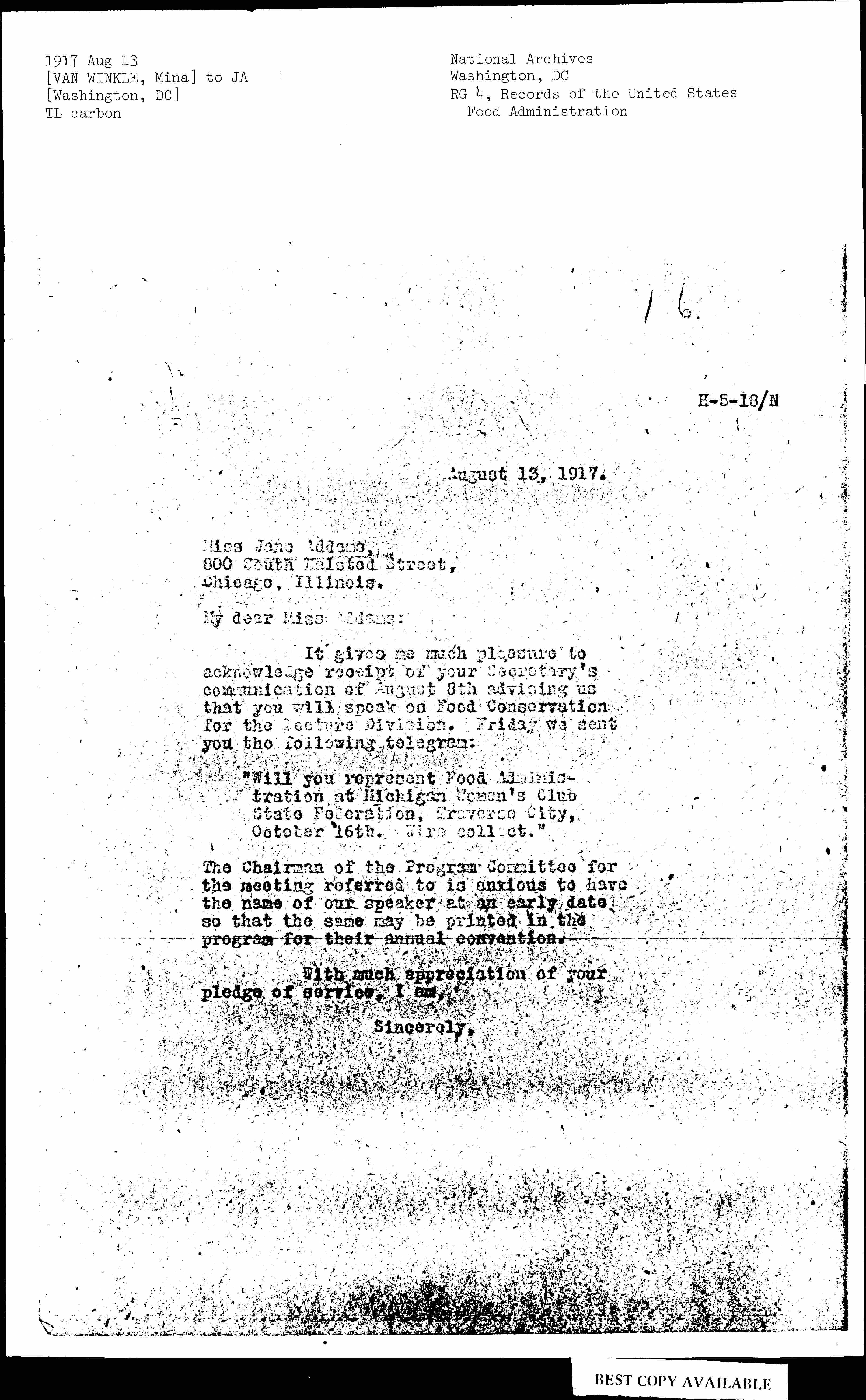 "Will you represent Food Administration at Michigan Women's Club State Federation, Traverse City, October 16th. Wire collect."