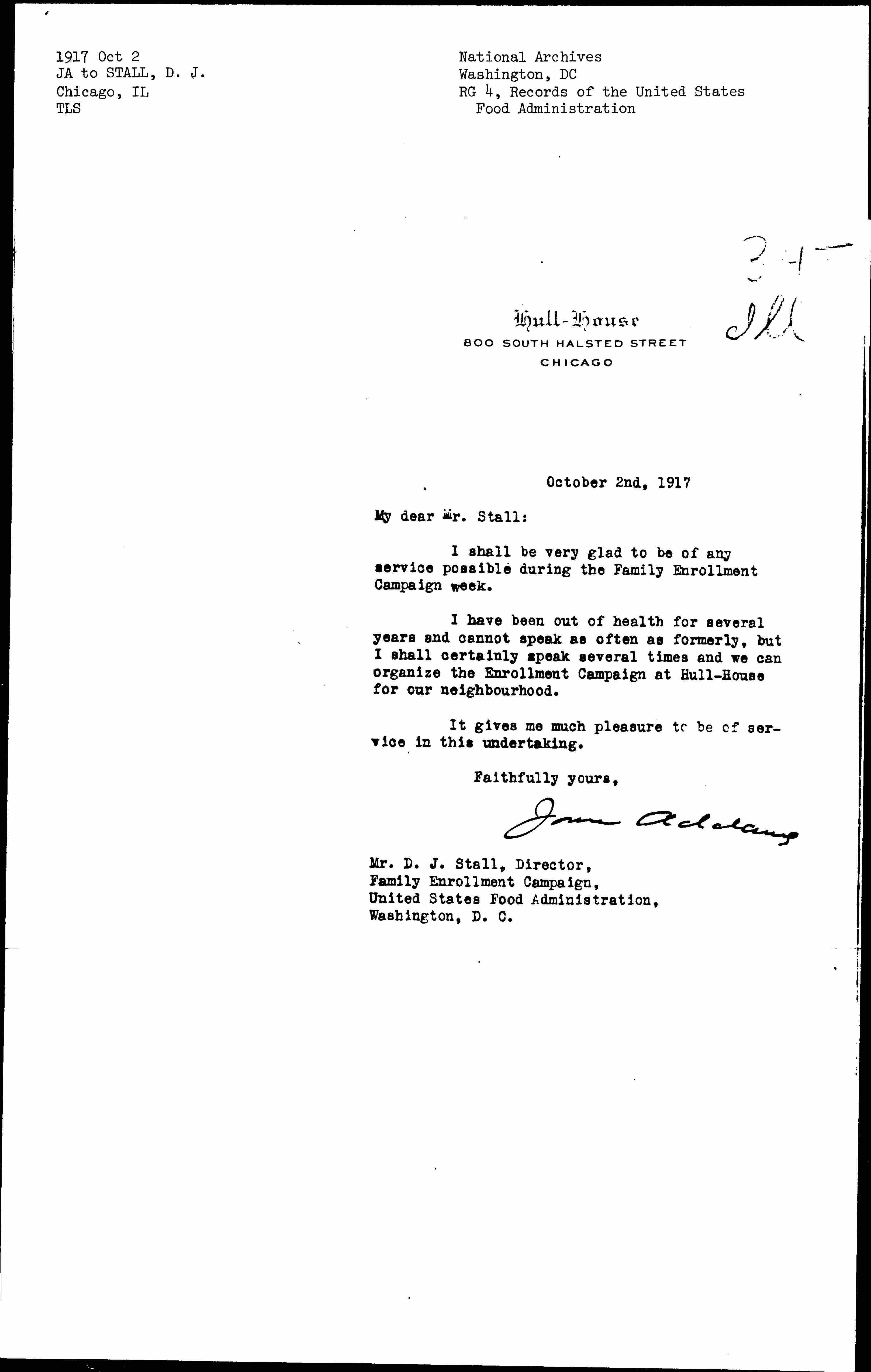 I have been out of health for several years and cannot speak as often as formerly, but I shall certainly speak several times and we can organize the Enrollment Campaign at Hull-House for our [neighborhood].