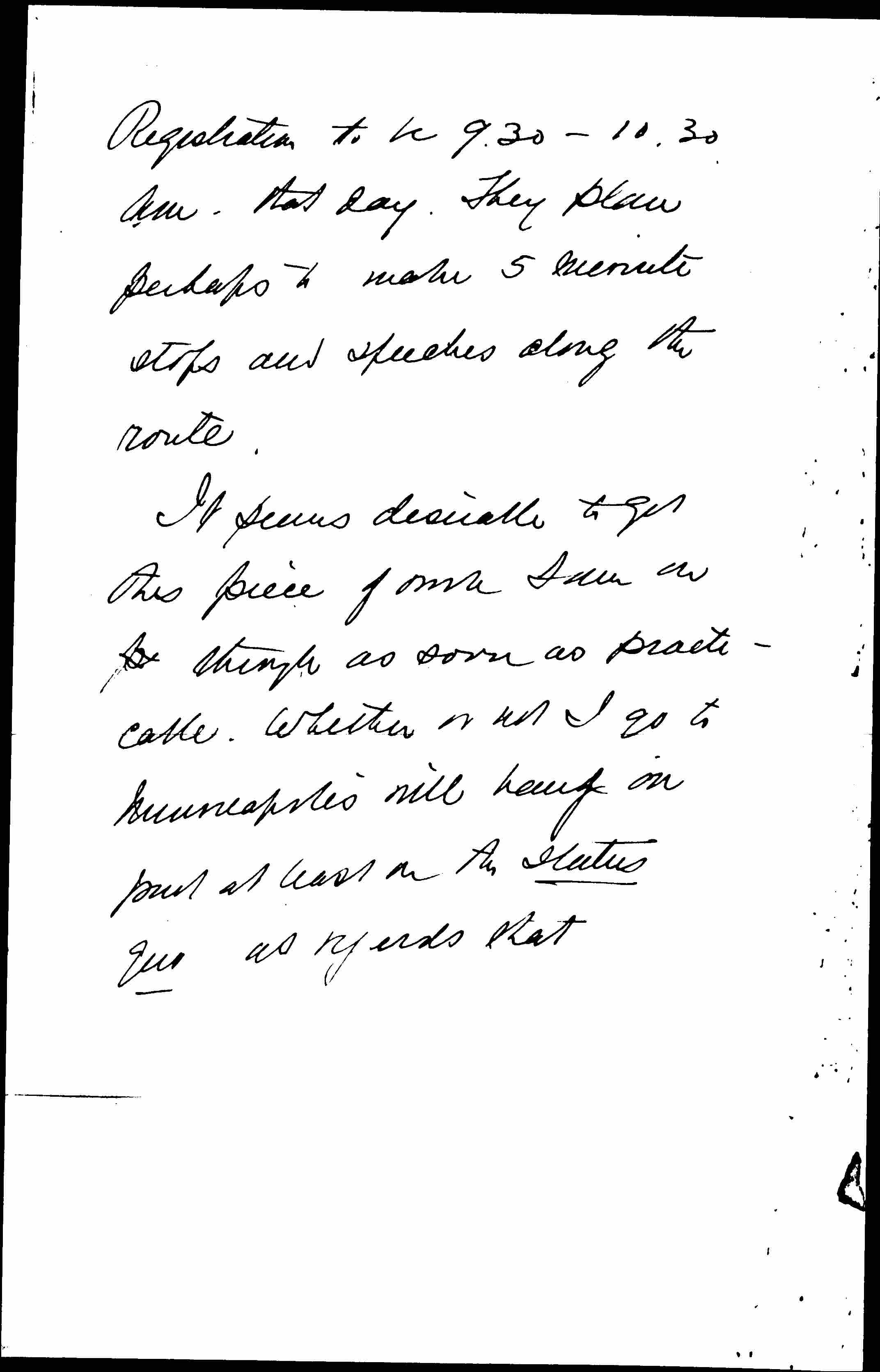 The special train is planned to leave NYC 2 pm August 30, and to reach Chicago at 6.30 pm August 31, & Minneapolis 7.30 am. the first of Sept. [page 2] Registration to be 9.30-10.30 a.m. that day. They plan perhaps to make 5 minute stops and speeches along the route.