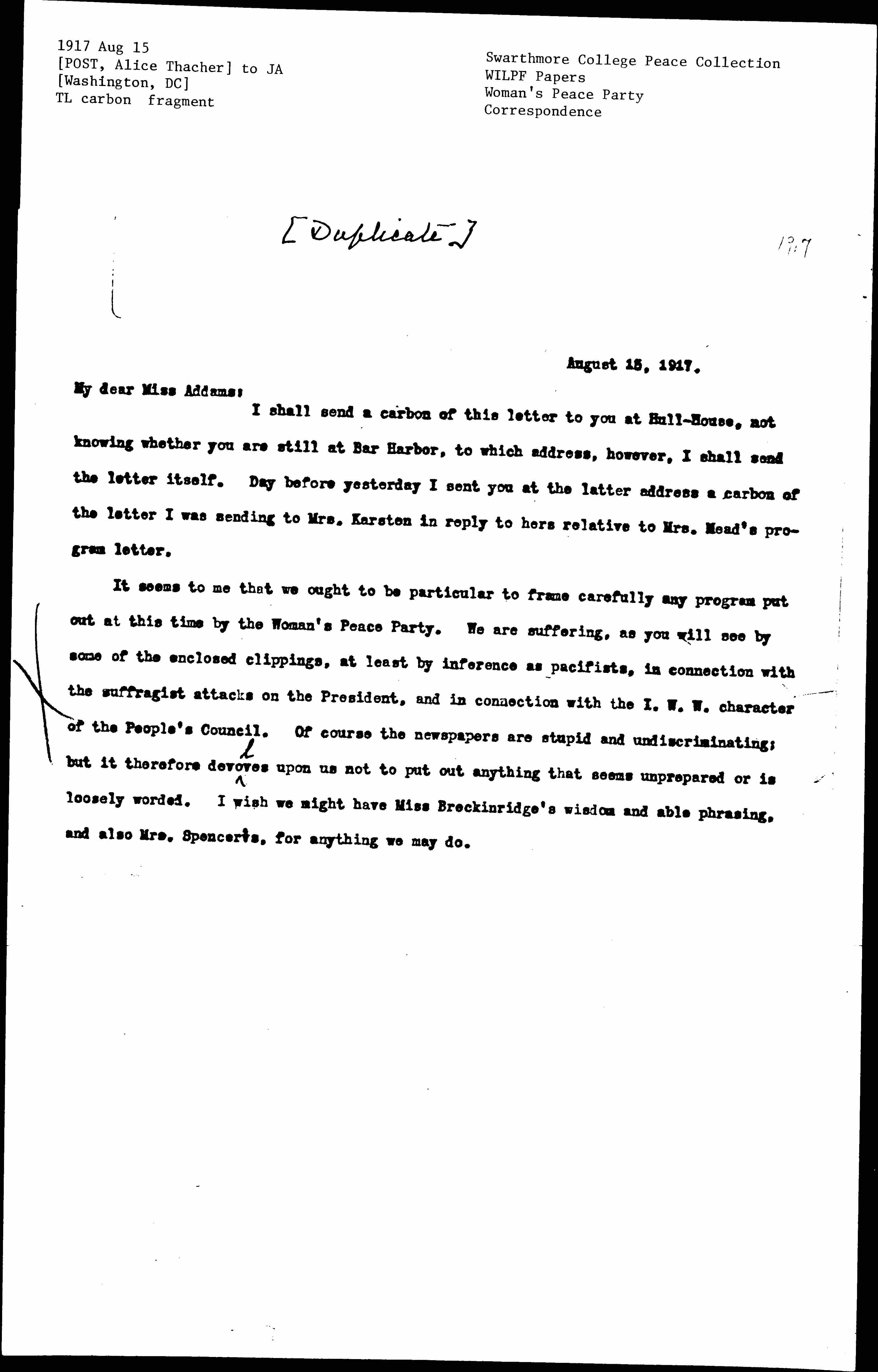 It seems to me that we ought to be particular to frame carefully any program put out at this time by the Woman's Peace Party. We are suffering, as you will see by some of the enclosed clippings, at least by inference as pacifists, in connection with the suffragist attacks on the President, and in connection with the I.W.W. character of the People's Council. Of course the newspapers are stupid and undiscriminating; but it therefore devolves upon us not to put out anything that seems unprepared or is loosely worded. I wish we might have Miss Breckinridge's wisdom and able phrasing, and also Mrs. Spencer's, for anything we may do.