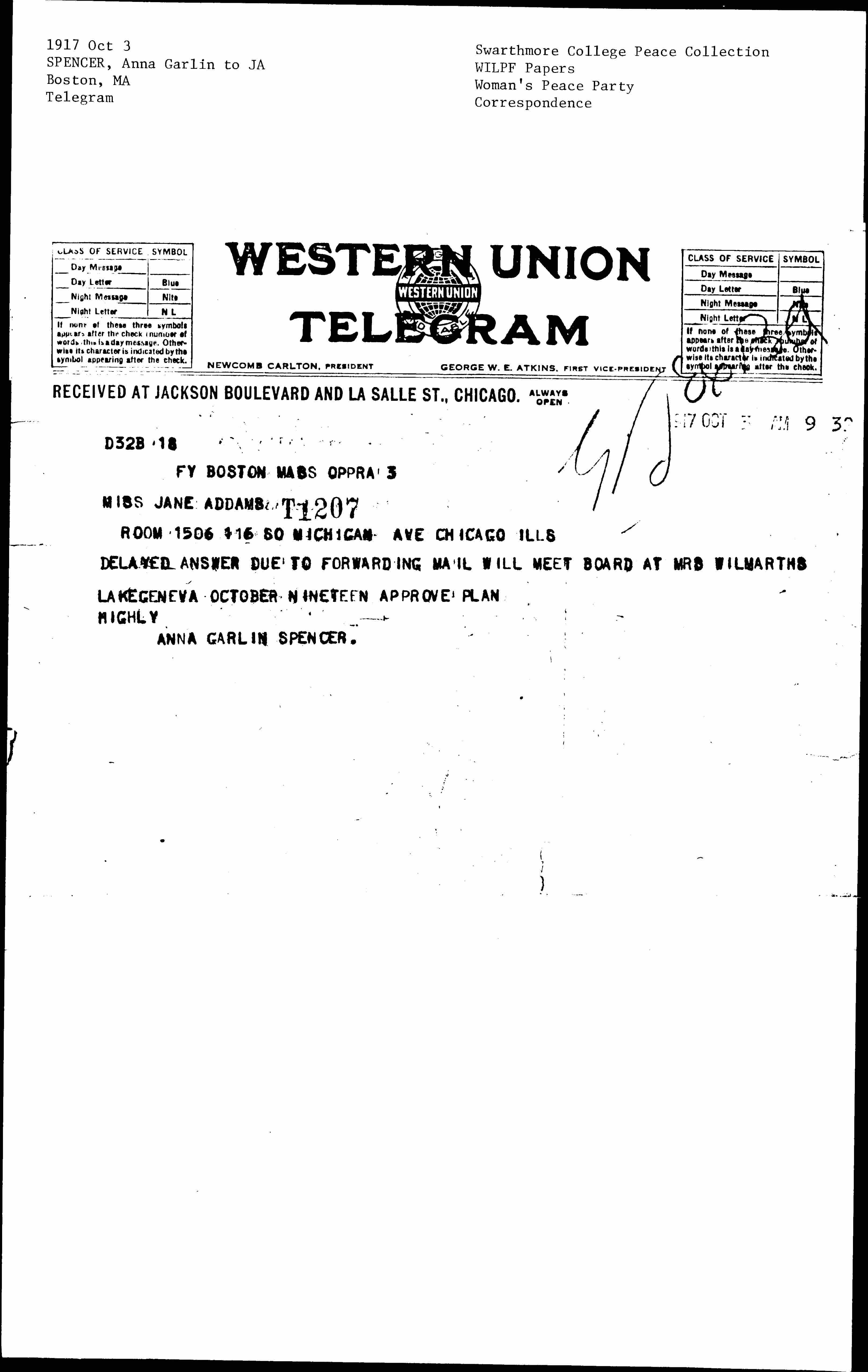 DELAYED ANSWER DUE TO FORWARDING MAIL WILL MEET BOARD AT MRS WILMARTHS LAKE GENEVA OCTOBER NINETEEN APPROVE PLAN HIGHLY