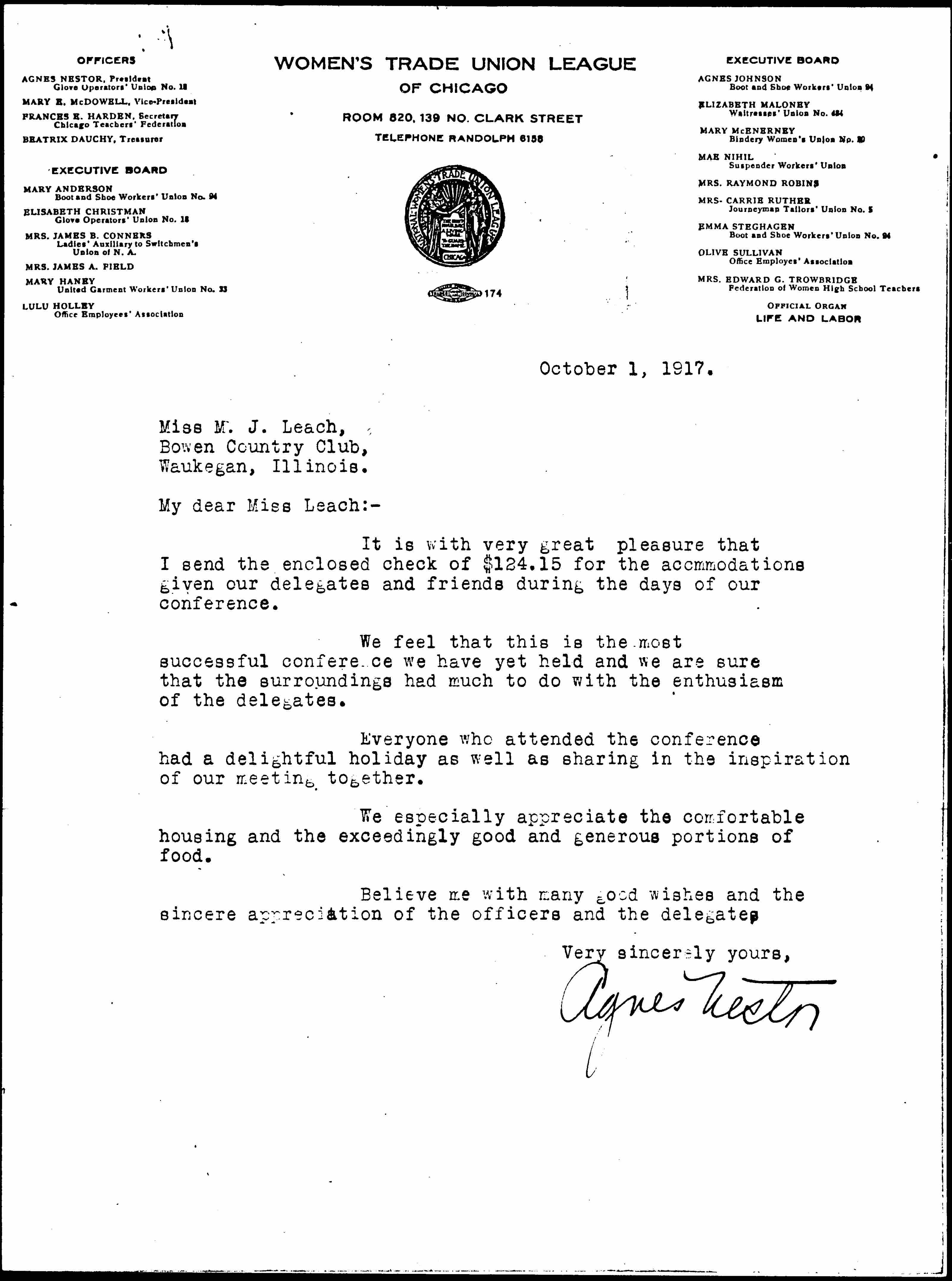 It is with very great pleasure that I send the enclosed check of $124.15 for the [accommodations] given our delegates and friends during the days of our conference.