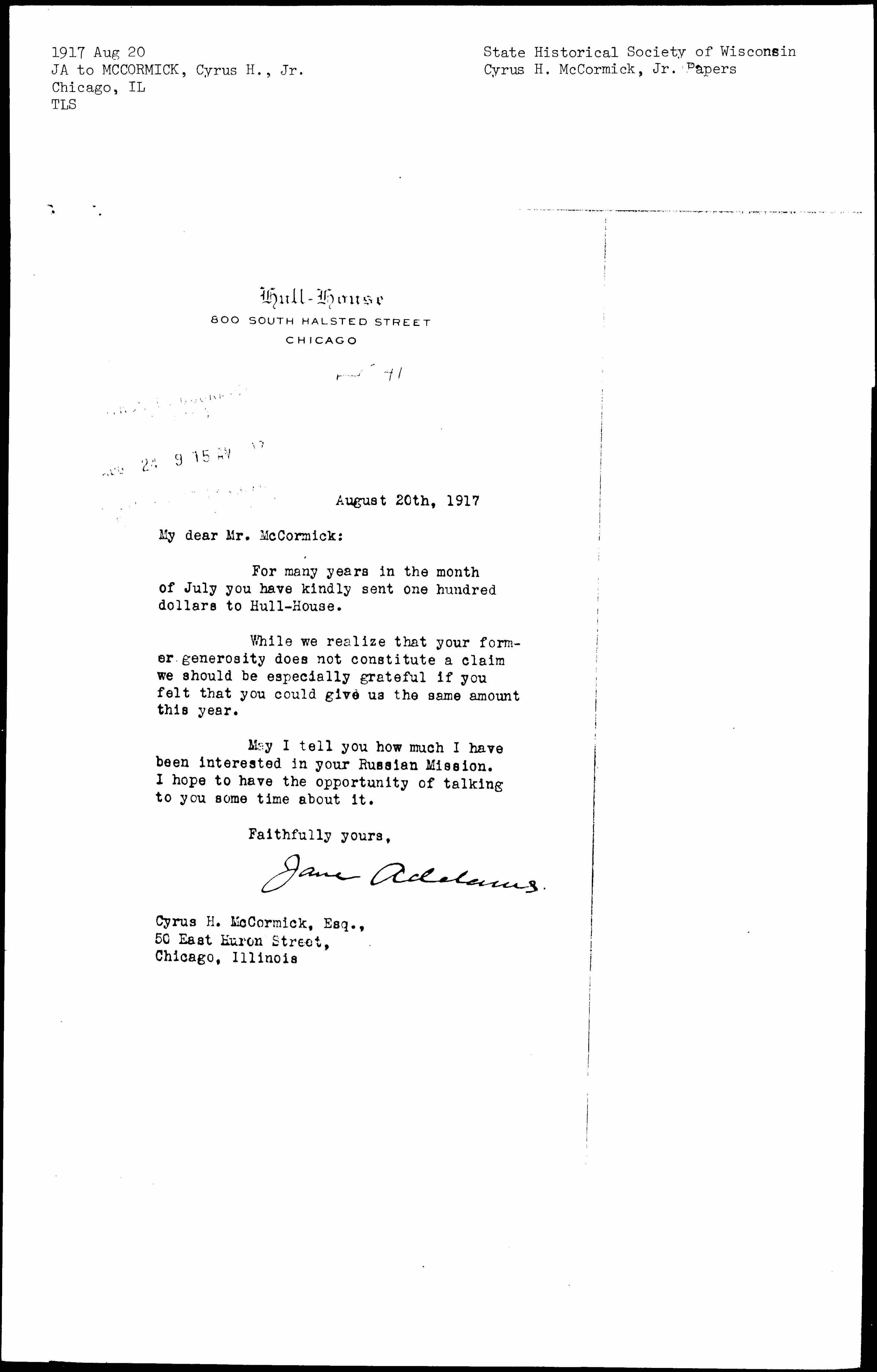 For many years in the month of July you have kindly send one hundred dollars to Hull-House.