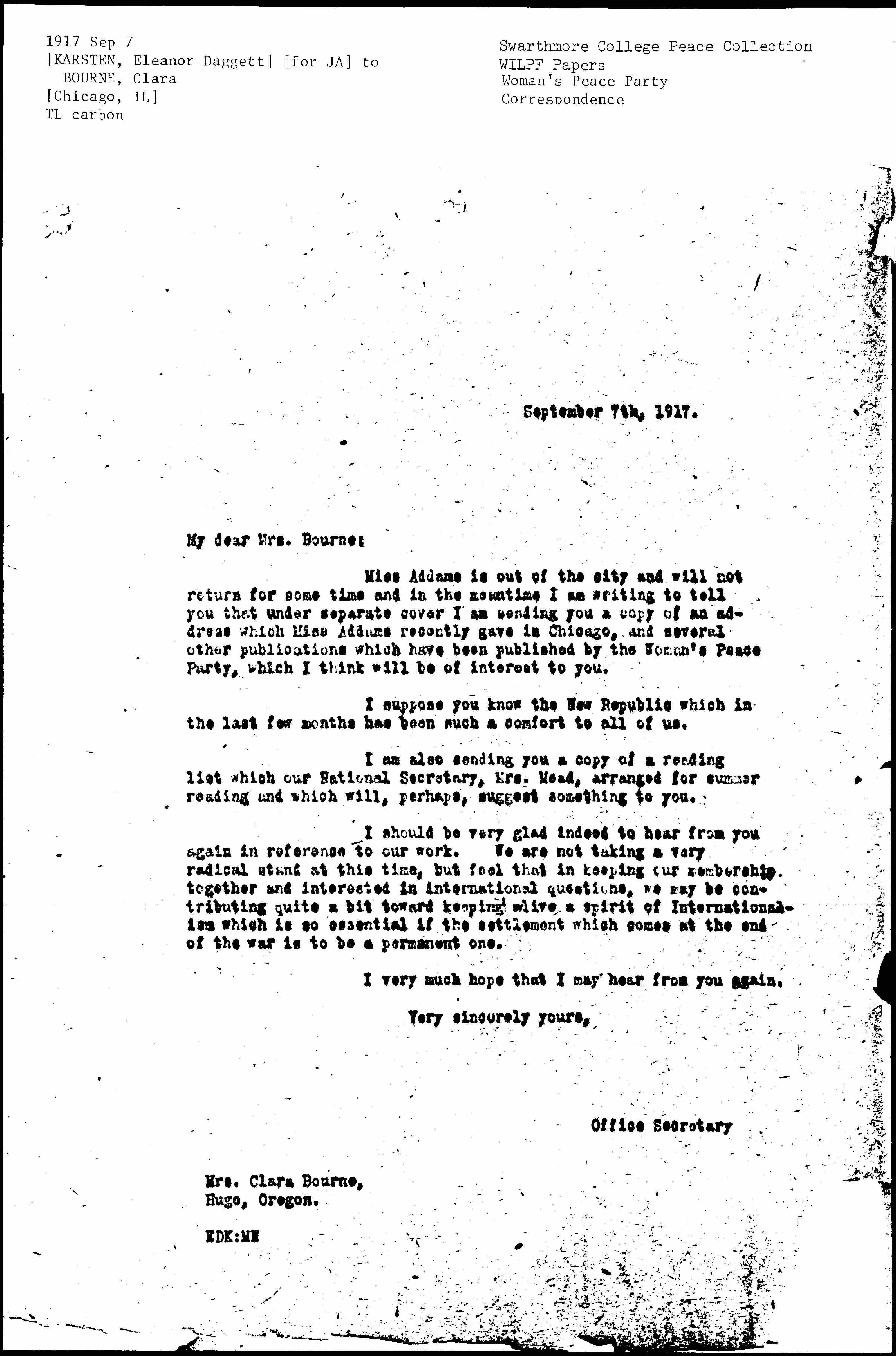 I should be very glad indeed to hear from you again in reference to our work. We are not taking a very radical stand at this time, but feel that in keeping our membership together and interested in international questions, we may be contributing quite a bit toward keeping alive a spirit of Internationalism which is so essential if the settlement which comes at the end of the war is to be a permanent one.
