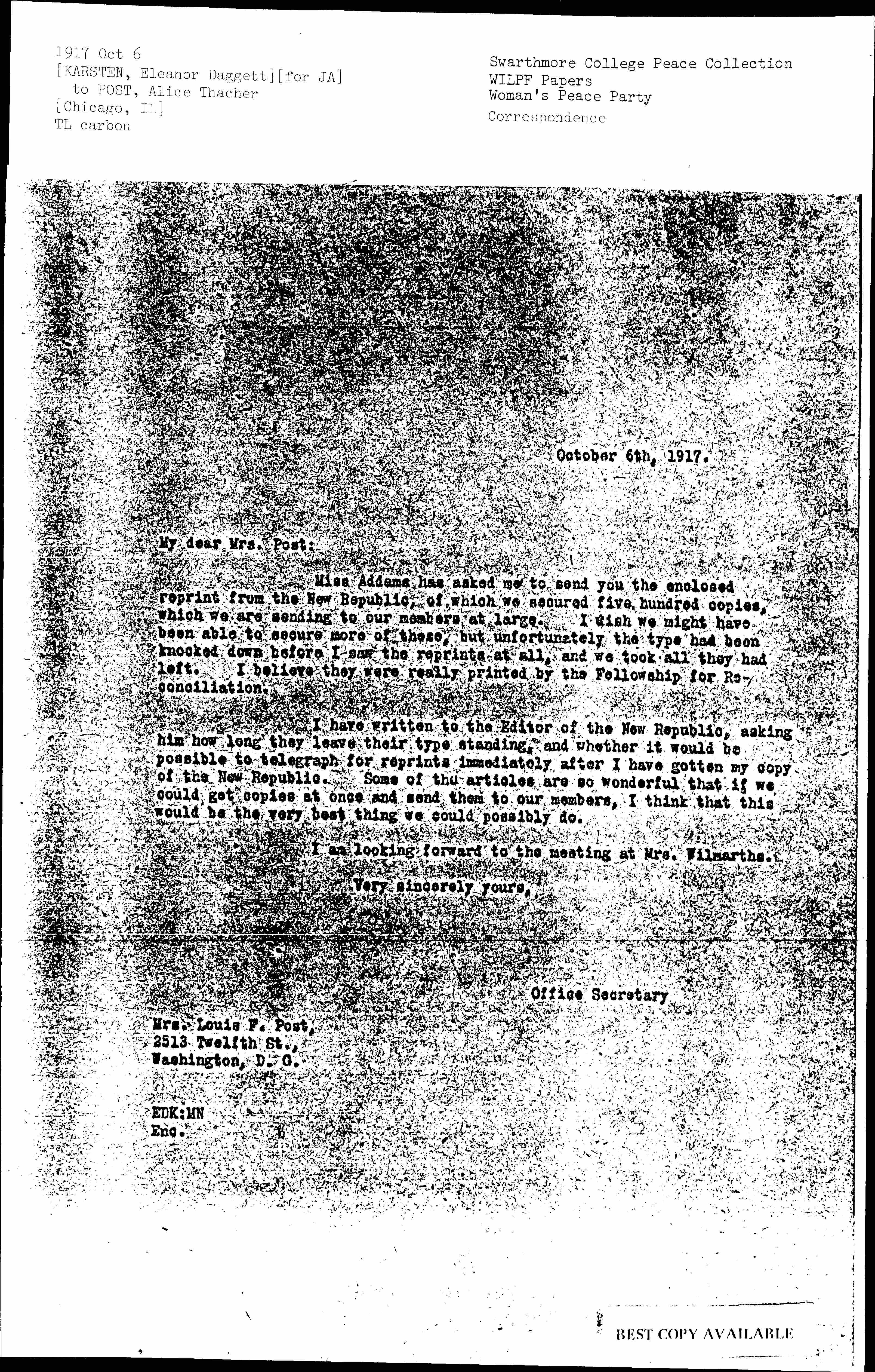 Miss Addams has asked me to send you the enclosed reprint from the New Republic, of which we secured five hundred copies, which we are sending to our members at large. I wish we might have been able to secure more of these, but unfortunately the type had been knocked down before I saw the reprints at all, and we took all they had left. I believe they were really printed by the Fellowship for Reconciliation.