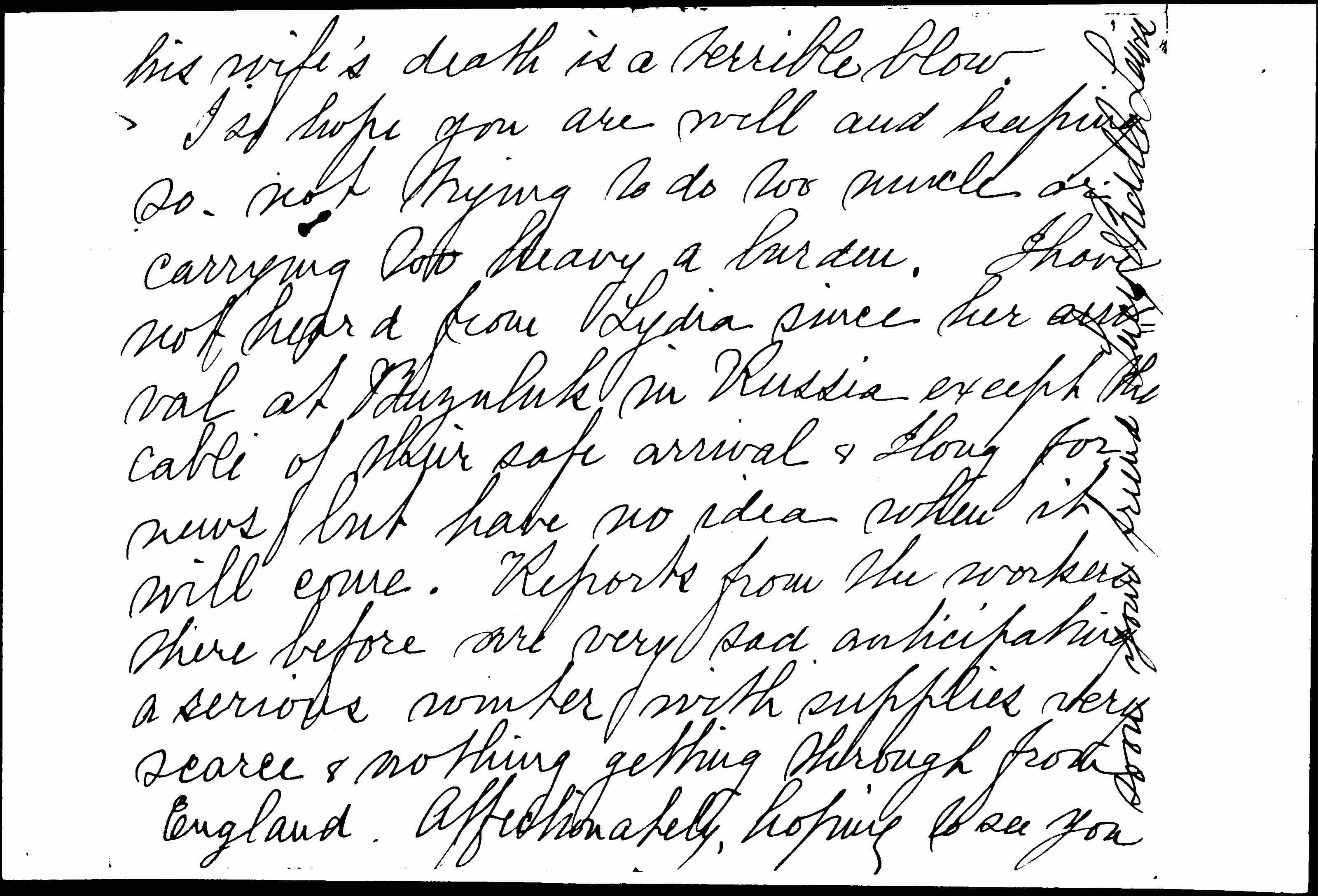 I so hope you are well and keeping so, not trying to do too much or carrying so heavy a burden. I have not heard from Lydia since her arrival at Buzuluk in Russia except the cable of their safe arrival & I long for news but have no idea when it will come. Reports from the workers there before are very sad anticipating a serious winter with supplies very scarce & nothing getting through from England.