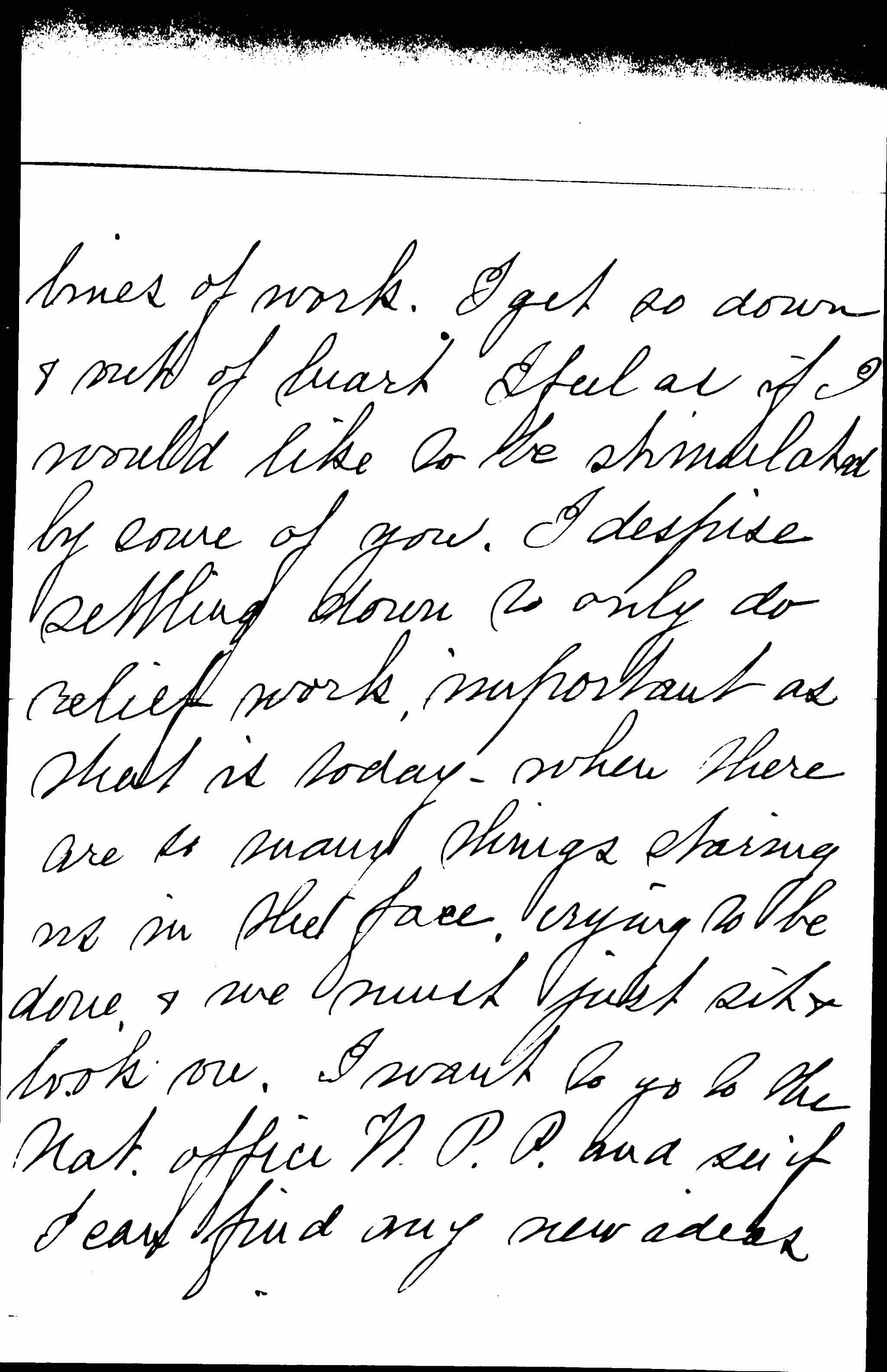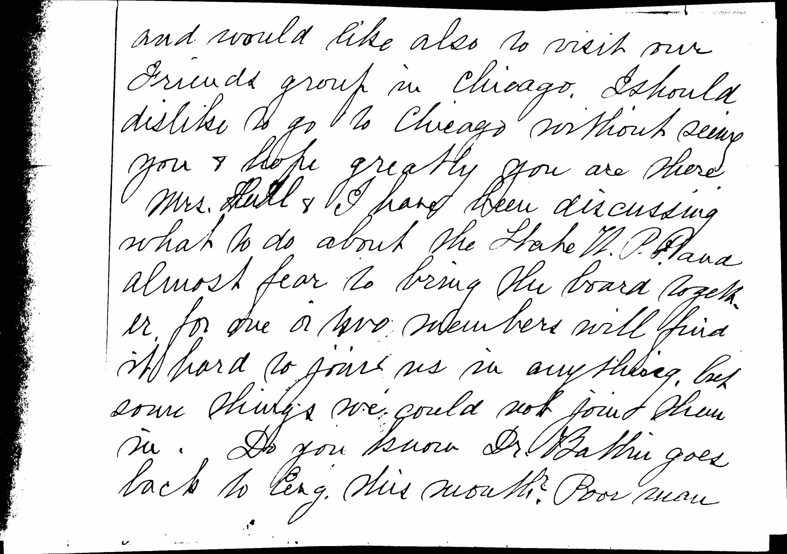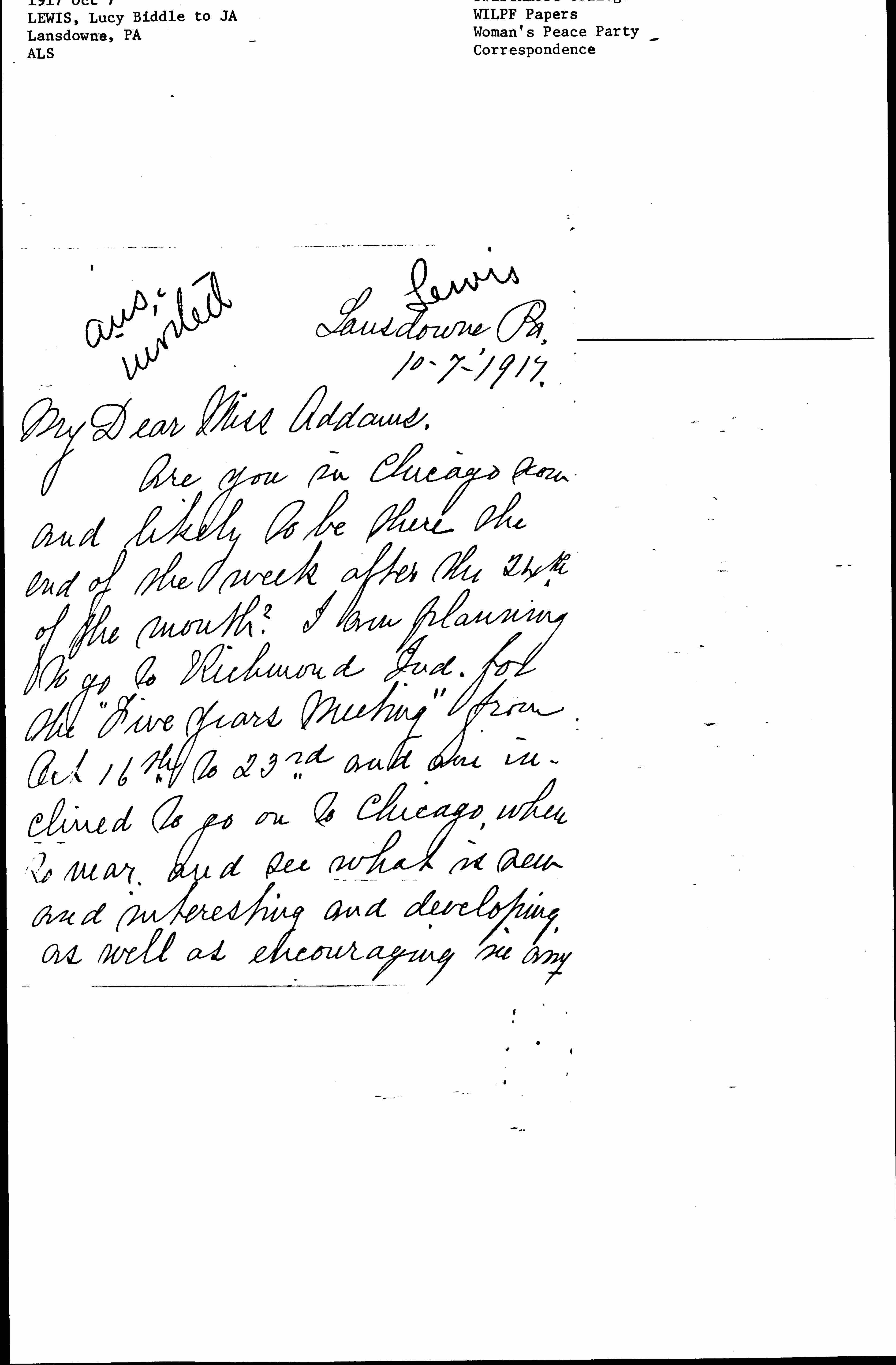 Are you in Chicago now and likely to be there the end of the week after the 24th of the month? I am planning to go to Richmond Ind. for the "Five Years Meeting" from Oct 16th to 23rd" and am inclined to go on to Chicago, when so near, and see what is new and interesting and developing as well as encouraging in any [page 2] lines of work. I get so down & out of heart I feel as if I would like to be stimulated by some of you. I despise settling down to only do relief work, important as that is today -- when there are so many things staring us in the face, crying to be done, & we must just sit & look on. I want to go to the Nat. office W.P.P. and see if I can find any new ideas [page 3] and would like also to visit our Friends group in Chicago. I should dislike to go to Chicago without seeing you & hope greatly you are there. Mrs. Hull & I have been discussing what to do about the State W.P.P. and almost fear to bring the board together for one or two members will find it hard to join us in anything, but some things we could not join them in. Do you know Dr. Battin goes back to Eng. this month? Poor man [page 4] his wife's death is a terrible blow.
