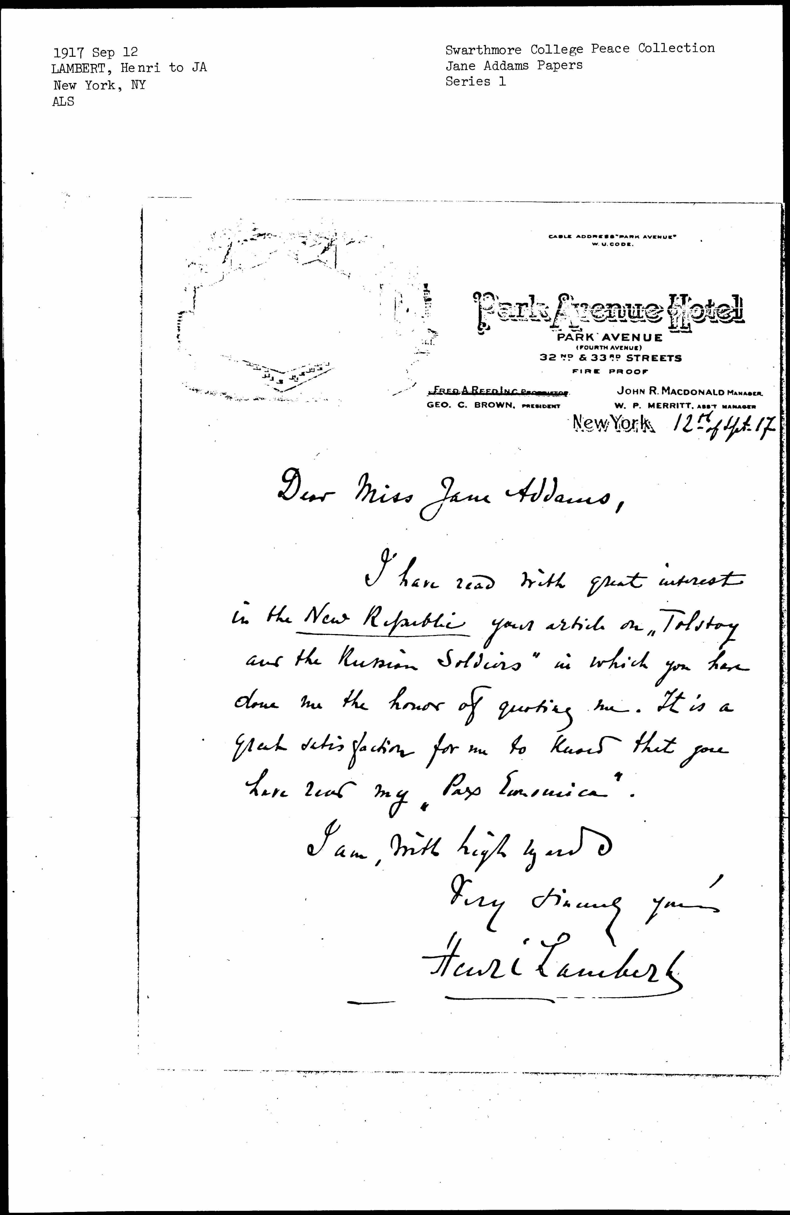 I have read with great interest in the New Republic your article on "Tolstoy and the Russian Soldiers" in which you have done me the honor of quoting me. It is a great satisfaction for me to know that you have read my "Pax Economica".
