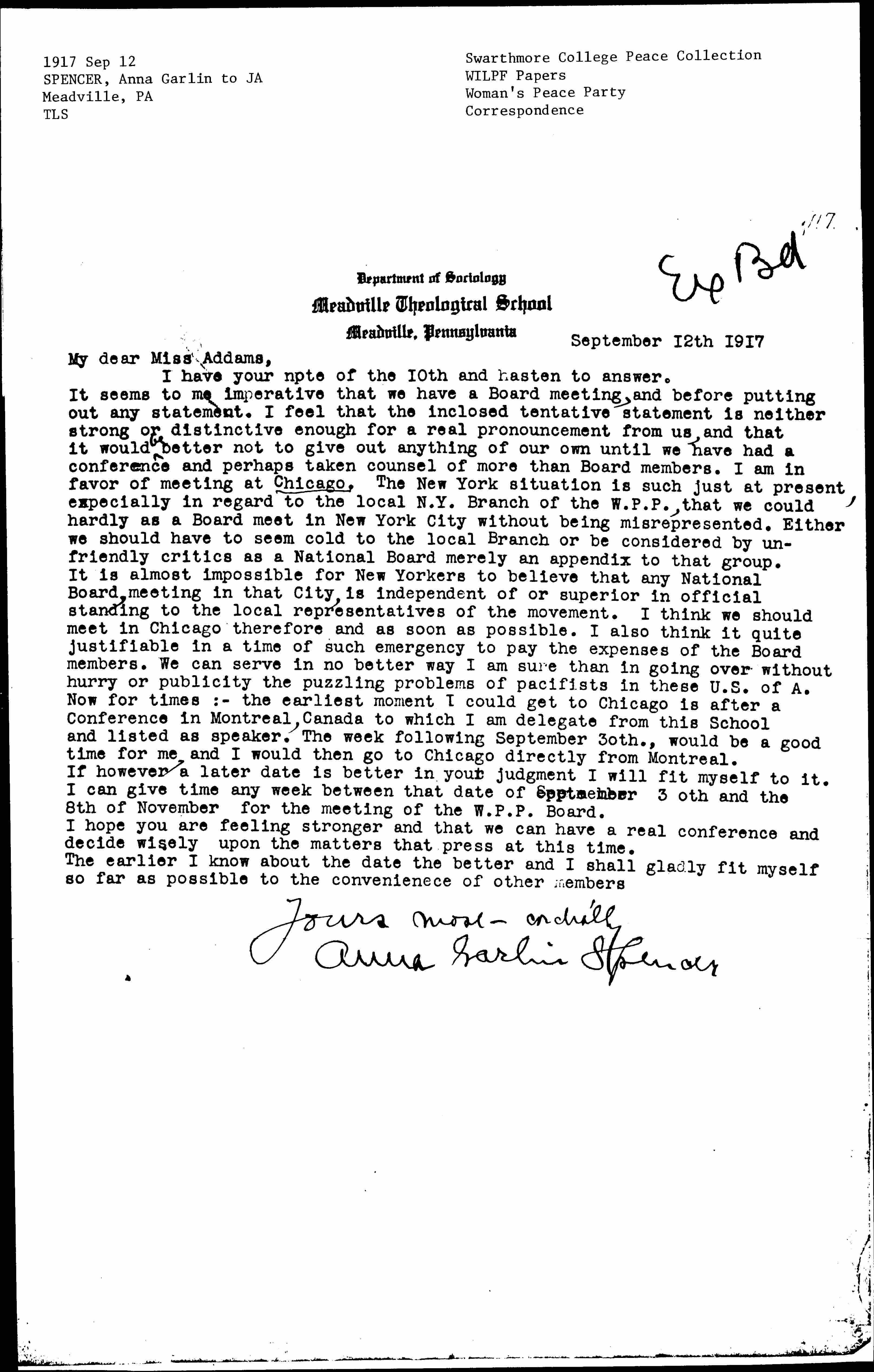 It seems to me imperative that we have a Board meeting↑,↓ and before putting out any statement. I feel that the [enclosed] tentative statement is neither strong or distinctive enough for a real pronouncement from us↑,↓ and that it would ↑be↓ better not to give out anything of our own until we have had a conference and perhaps taken counsel of more than Board members. I am in favor of meeting at Chicago. The New York situation is such just at present↑,↓ especially in regard to the local N.Y. Branch of the W.P.P.↑,↓ that we could hardly as a Board meet in New York City without being misrepresented. Either we should have to seem cold to the local Branch or be considered by unfriendly critics as a National Board merely an appendix to that group. It is almost impossible for New Yorkers to believe that any National Board↑,↓ meeting in that City↑,↓ is independent of or superior in official standing to the local representatives of the movement. I think we should meet in Chicago therefore and as soon as possible. I also think it quite justifiable in a time of such emergency to pay the expenses of the Board members. We can serve in no better way I am sure than in going over without hurry or publicity the puzzling problems of pacifists in these U.S. of A. Now for times: -- the earliest moment I could get to Chicago is after a Conference in Montreal↑,↓ Canada to which I am delegate from this School and listed as speaker. The week following September 30th., would be a good time for me↑,↓ and I would then go to Chicago directly from Montreal. If however a later date is better in your judgment I will fit myself to it. I can give time any week between that date of September 30th and the 8th of November for the meeting of the W.P.P. Board.