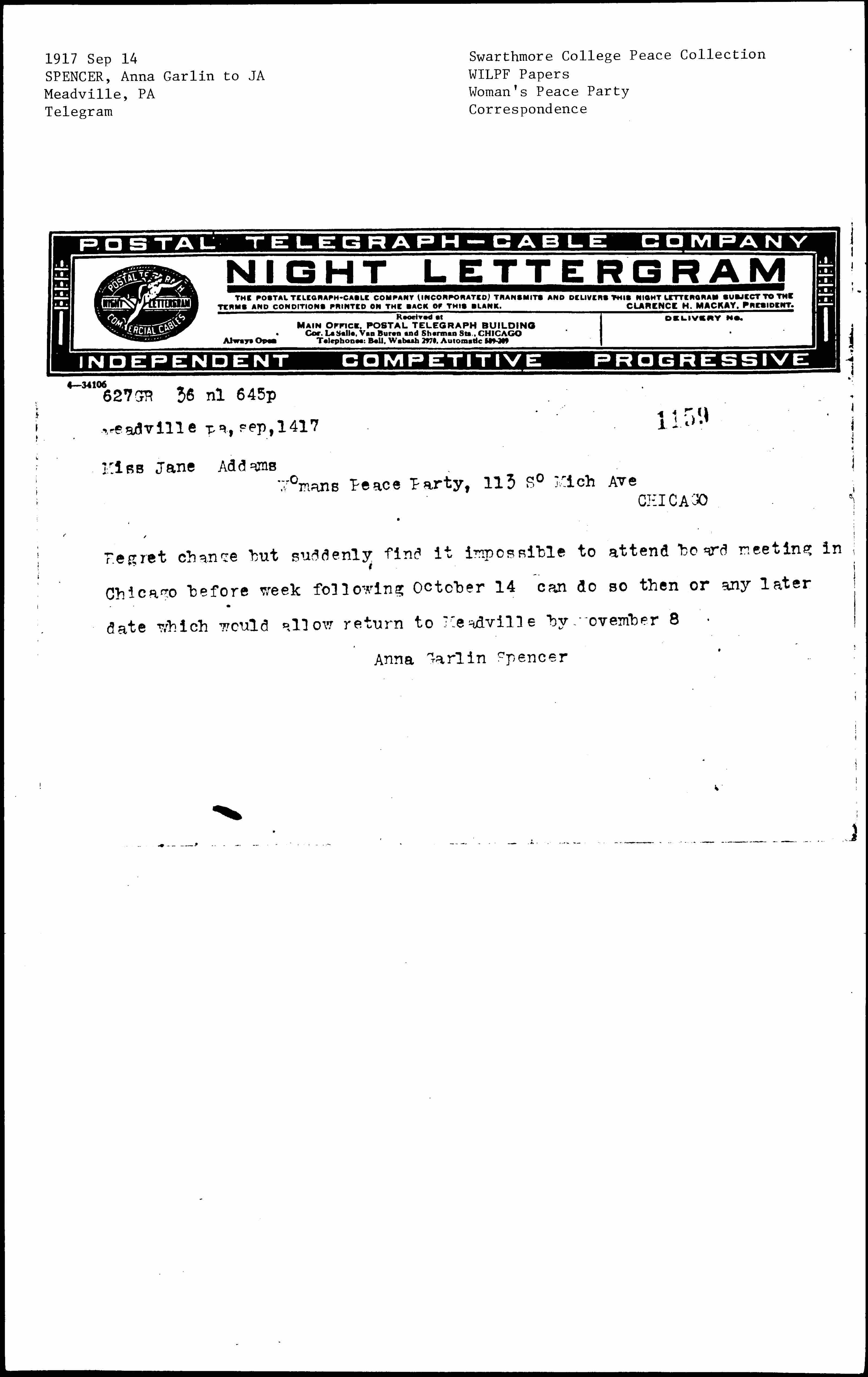 Regret change but suddenly find it impossible to attend board meeting in Chicago before week following October 14 can do so then or any later date which would allow return to Meadville by November 8